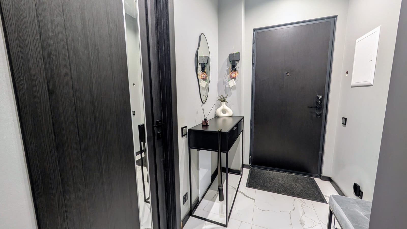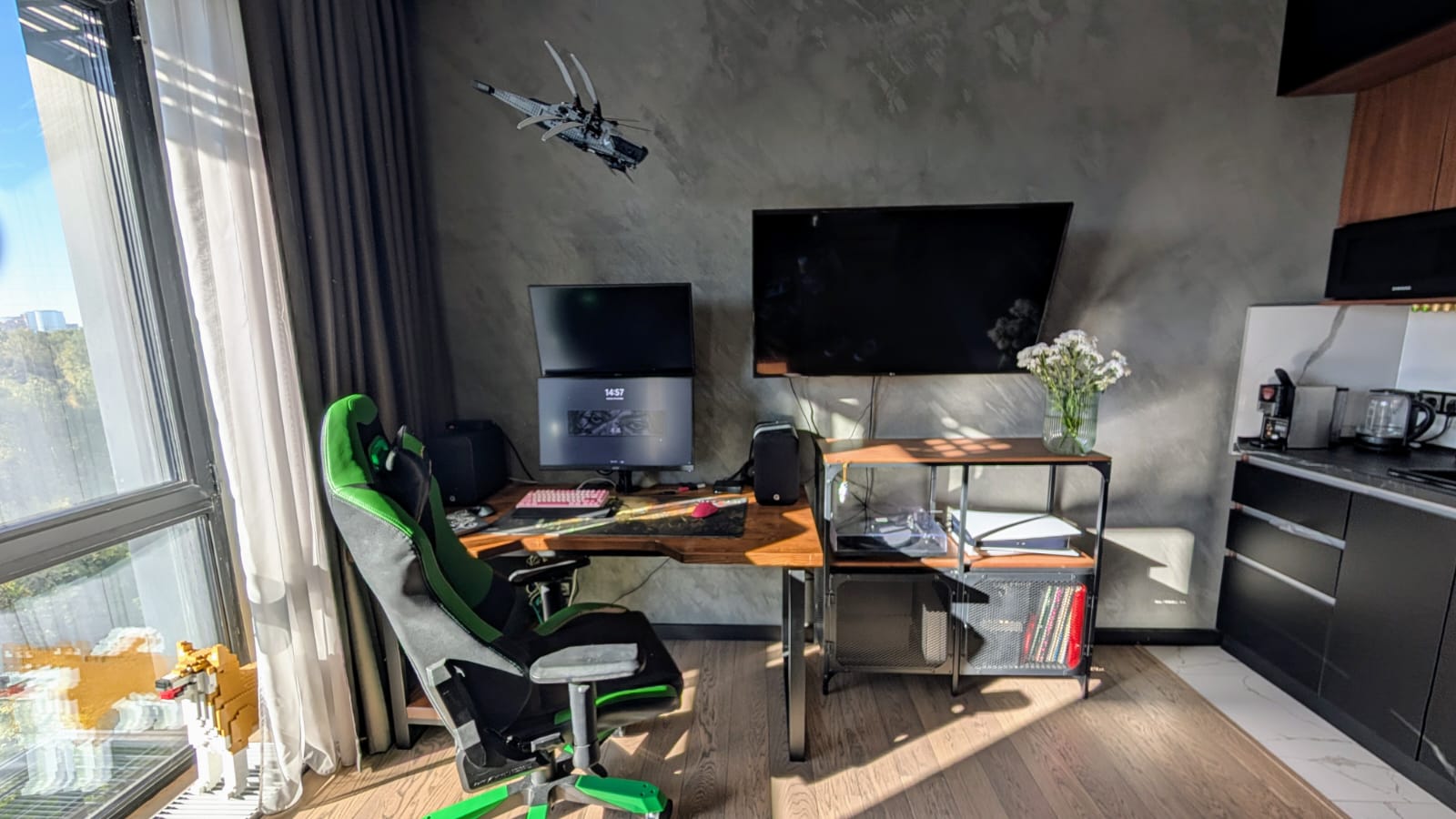 В квартире остается вся мебель и техника, кроме компьютеров, винилового проигрывателя, кофемашины, приставки, ионизатора и детской мебели (комода).