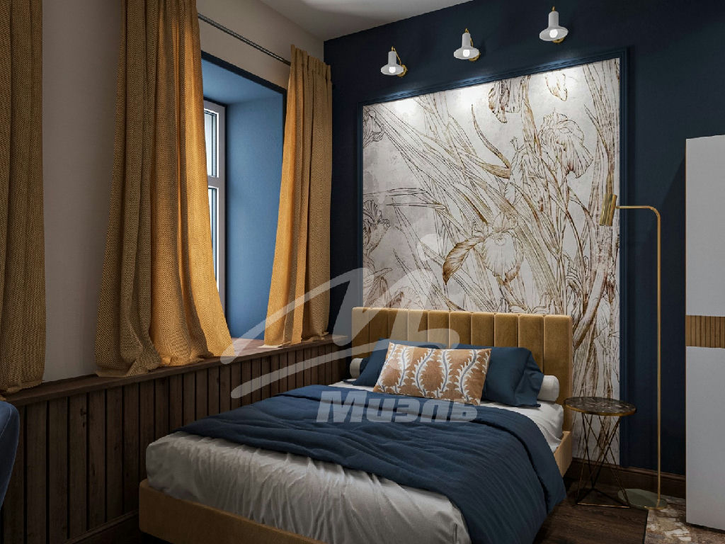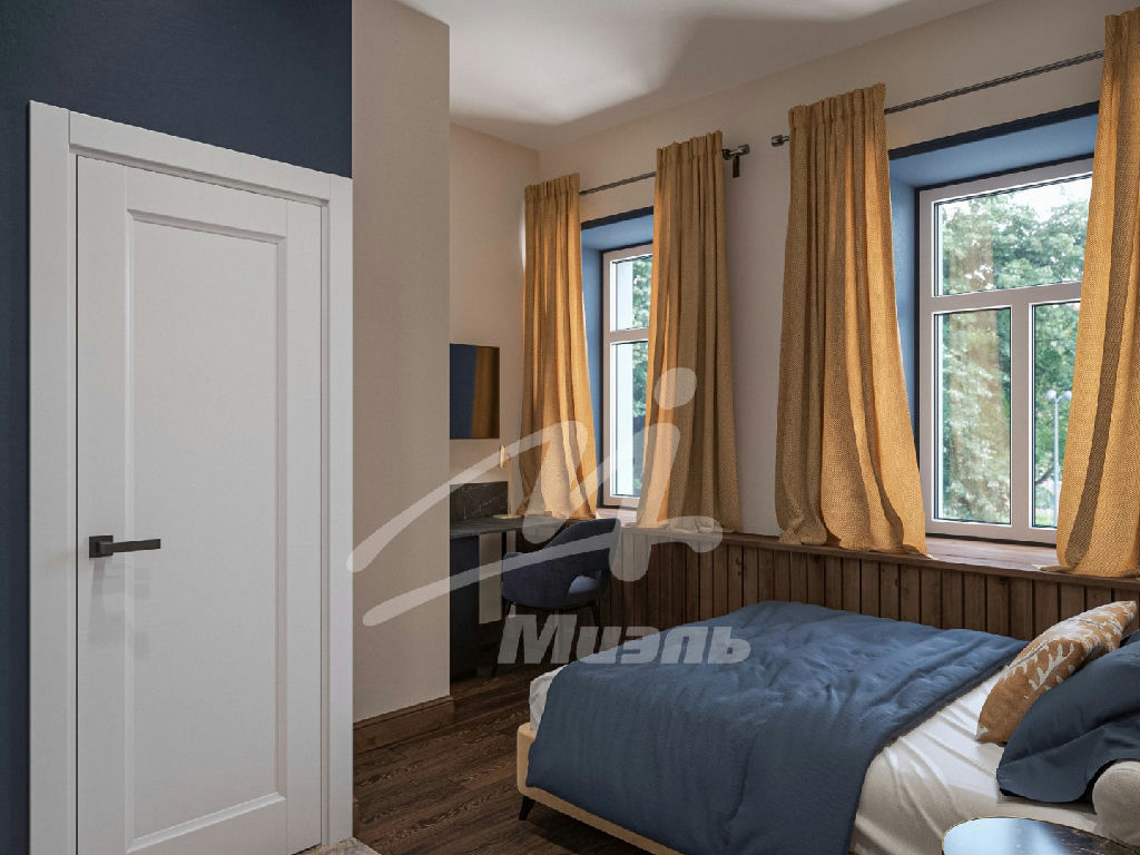 Площадь помещения 17,6 м2. Высота потолков 3.2м придает помещению объем и визуально увеличивает пространство. Помещение (1.14) расположено на 1м этаже особняка, и имеет 4 окна что значительно увеличивает инсоляцию объекта и делает помещение более объемным.