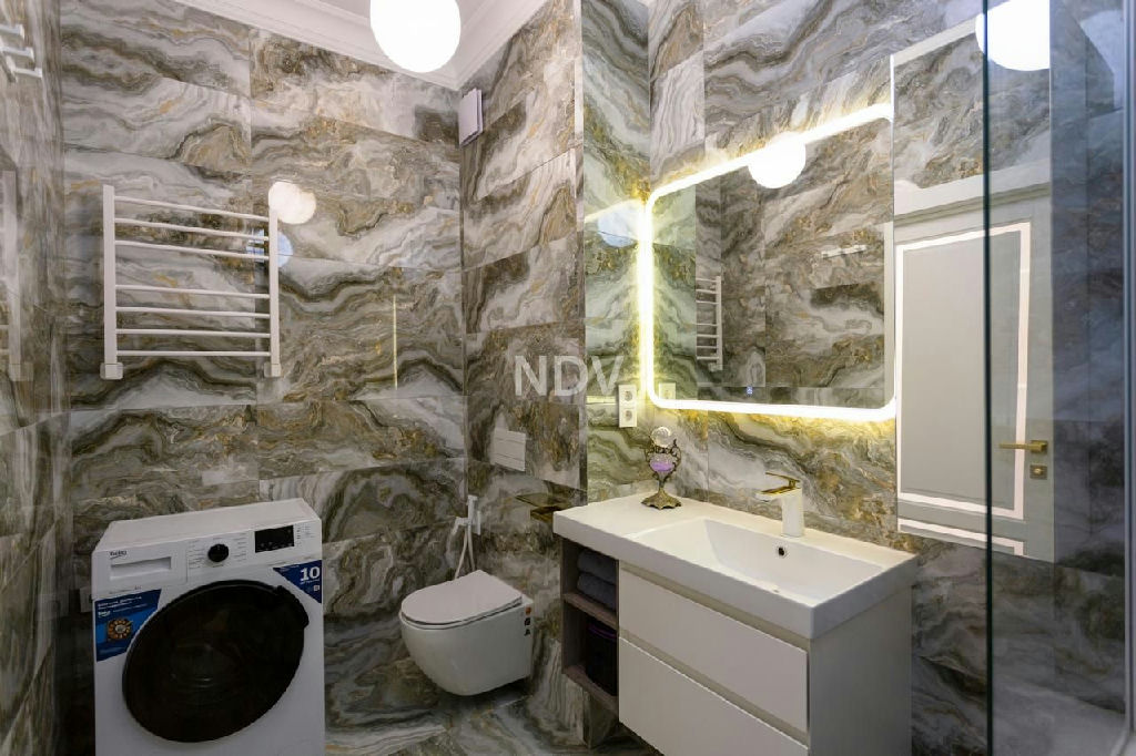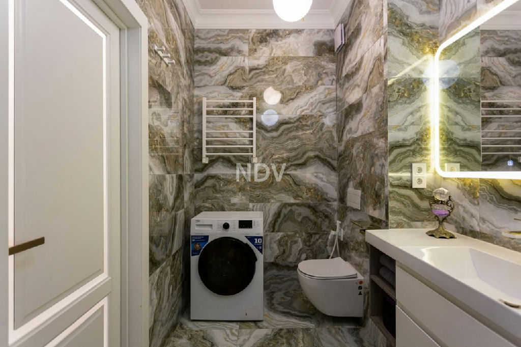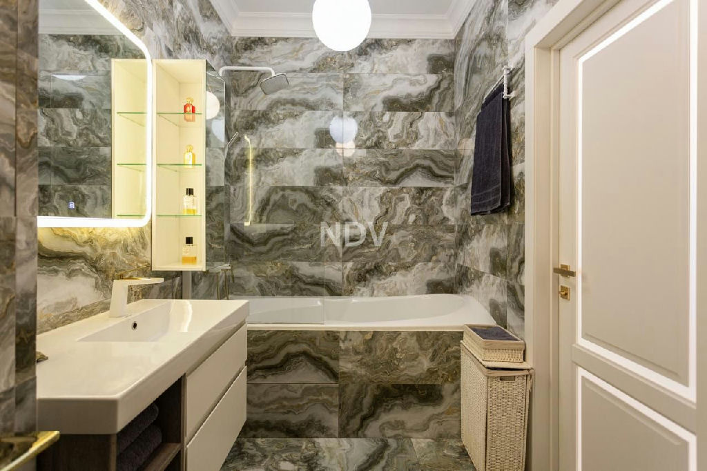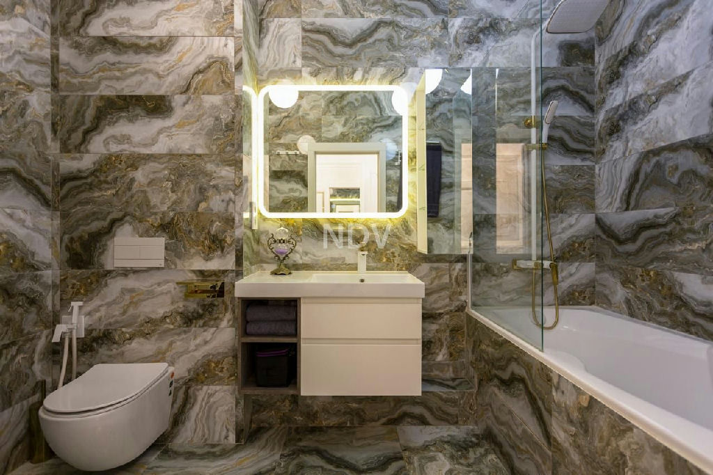 Особая гордость хозяйки это просторная ванная комната, выложенная итальянской плиткой под натуральный оникс. Стиральная машина, ванна со стеклянной перегородкой, подвесной унитаз со встроенной инсталляцией, гигиенический душ, система протечки воды Neptun, итальянское и чешское сантехническое оборудование все выполнено в едином стиле.