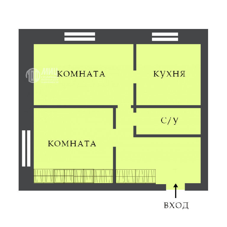 Кирпичный дом, комната разделена на две изолированные комнаты, в каждой комнате окно с видом на тихий зеленый двор, просторная кухня.