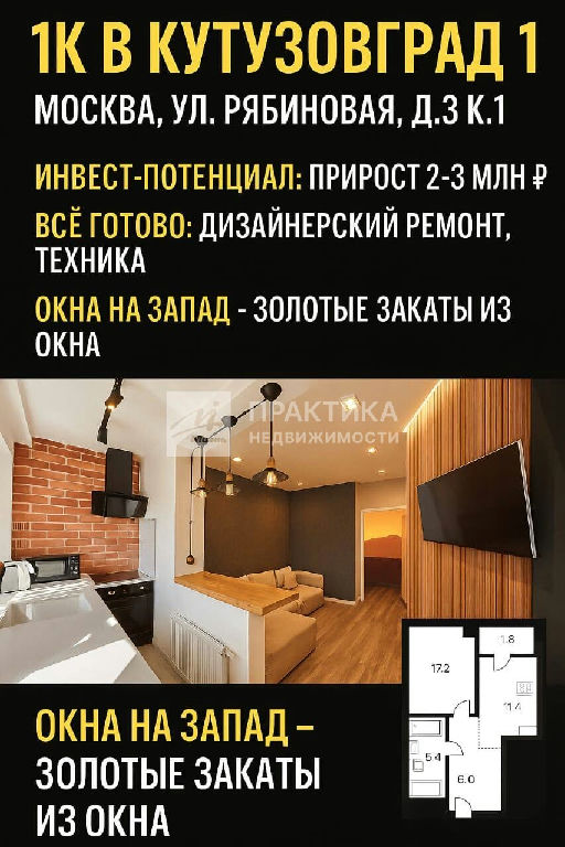 Код объекта: 2048899.Продается видовая 1-комнатная квартира в ЖК бизнес-класса "Кутузов Град" по адресу: Москва, Рябиновая 3к1. Квартира современная, стильная, уютная, продается с мебелью и техникой и может быть оставлена в квартире по-договоренности.Ремонт сделан из качественных материалов, в отличном состоянии, делали для себя.Окна на запад, красивые закаты.Цены на подобные квартиры всегда растут в цене. Инфраструктура:- У жителей квартала комфортный и быстрый доступ к ключевым дорожным артериям: Кутузовскому проспекту и его дублёру, МКАД, ТТК.- Для здорового образа жизни в квартале работает премиальный фитнес-клуб World Class с 25-метровым бассейном, сауной и хаммамом.- Для активностей на свежем воздухе предусмотрены универсальная спортивная площадка и воркаут-зоны.- В шаговой доступности школы, детские сады, супермаркеты, кафе, пекарни, салоны красоты.- Двор без машин с ландшафтным дизайном и спортивной площадкой. Внутри двора свой детский сад с углубленным изучением иностранных языков.В окружении "Кутузов Града" работают стадион и ФОК в парке "Кунцево", спортивные комплексы "Молодёжка", "Лата Трэк" и "Крылатское". Удобная транспортная доступность: 15 минут до м. Кунцевская, МЦД Рабочий поселок, прямой выезд наМожайское шоссе, Кутузовский проспект. Документы: полная стоимость в ДКП, квартира подходит под ипотеку.