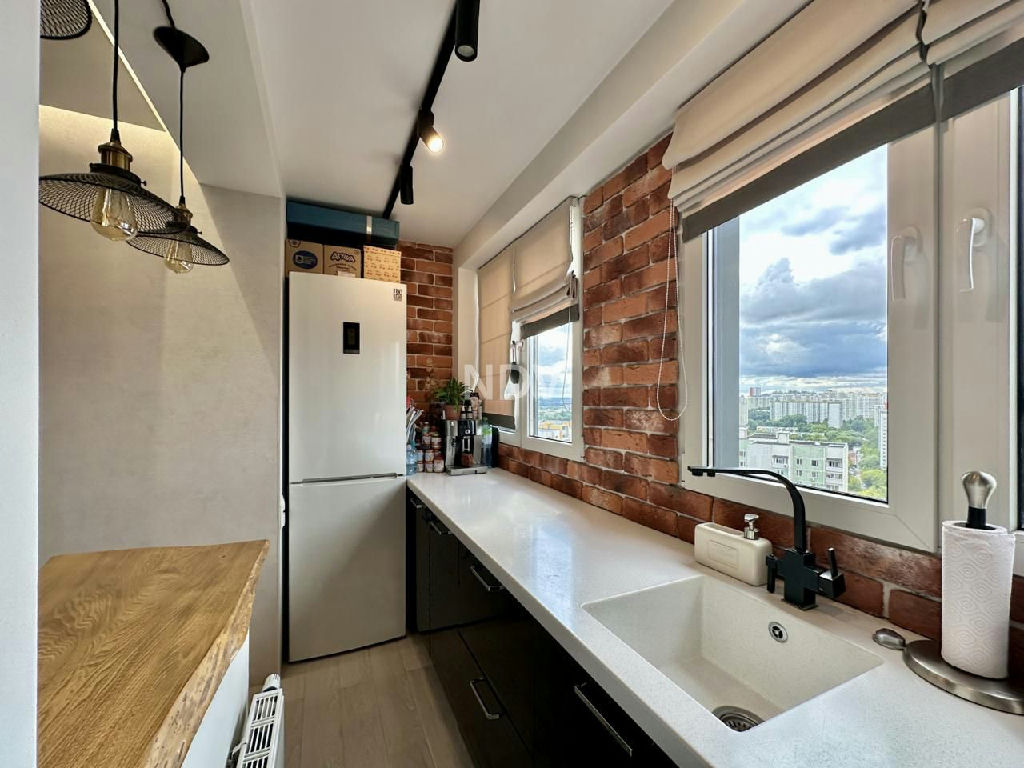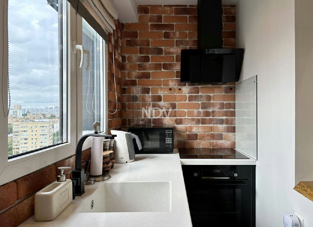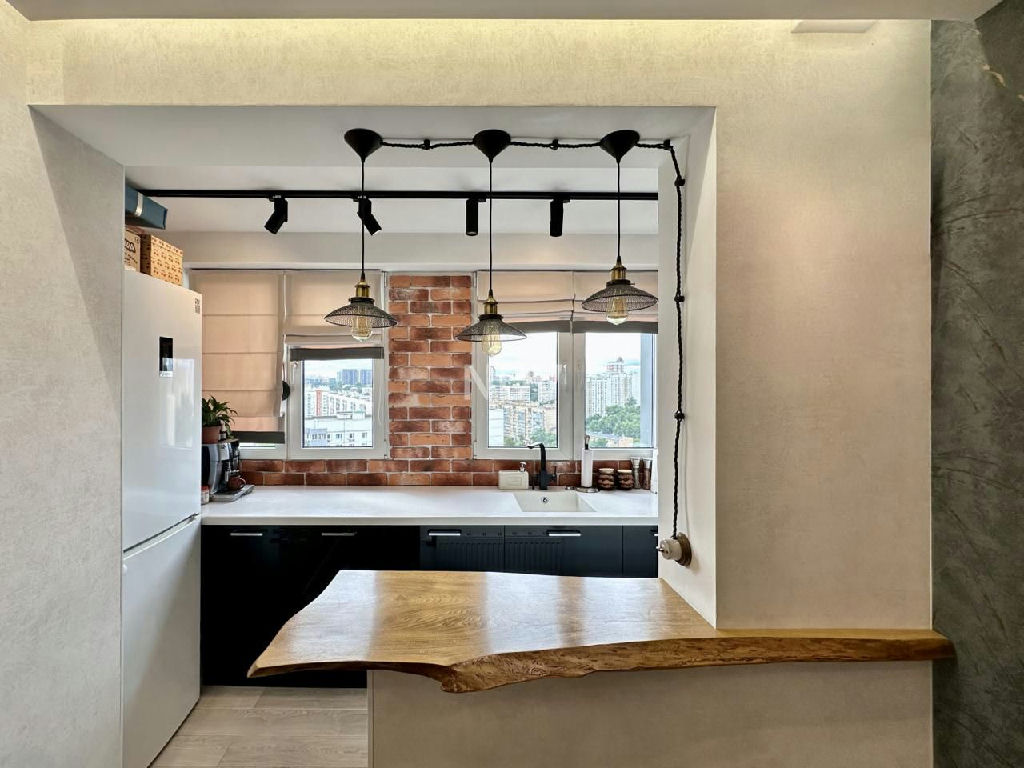 кухня перенесена в зону лоджии получилась светлая кухонная линия с видом