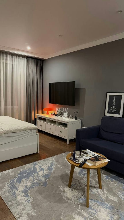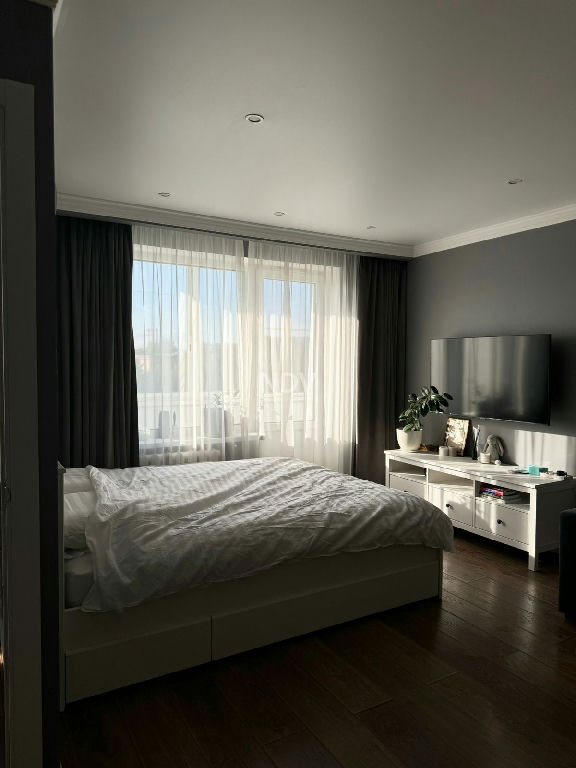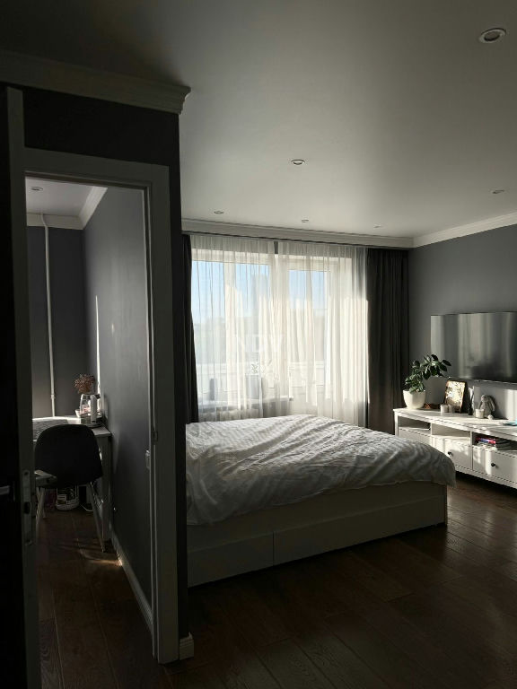 Большая светлая комната + просторный застеклённый балкон. Качественный евроремонт, всё свежее и аккуратное. Остаётся вся мебель и техника. Большой встроенный шкаф решает вопрос хранения. Совмещённый санузел в хорошем состоянии.