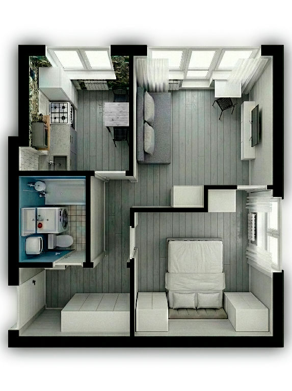 Согласно планировке: 2 изолированные комнаты, кухня, санузел. В квартире достаточно мест хранения - во встроенных шкафах, кровати с подъёмным механизмом. Грамотно продумано освещение, расположение розеток. Проведён скоростной интернет - есть всё для удалённой работы из дома.