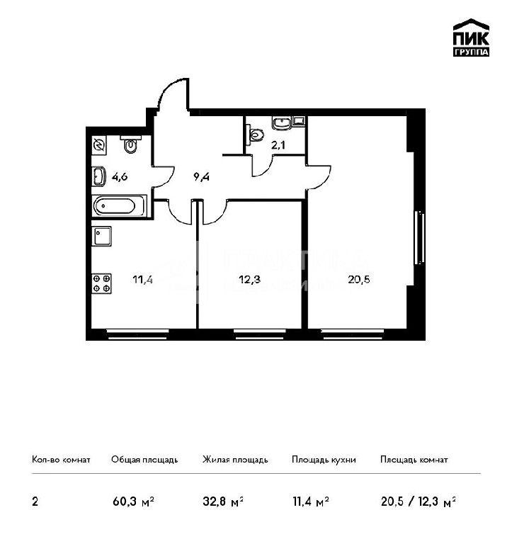 Общая: 60,7 м2