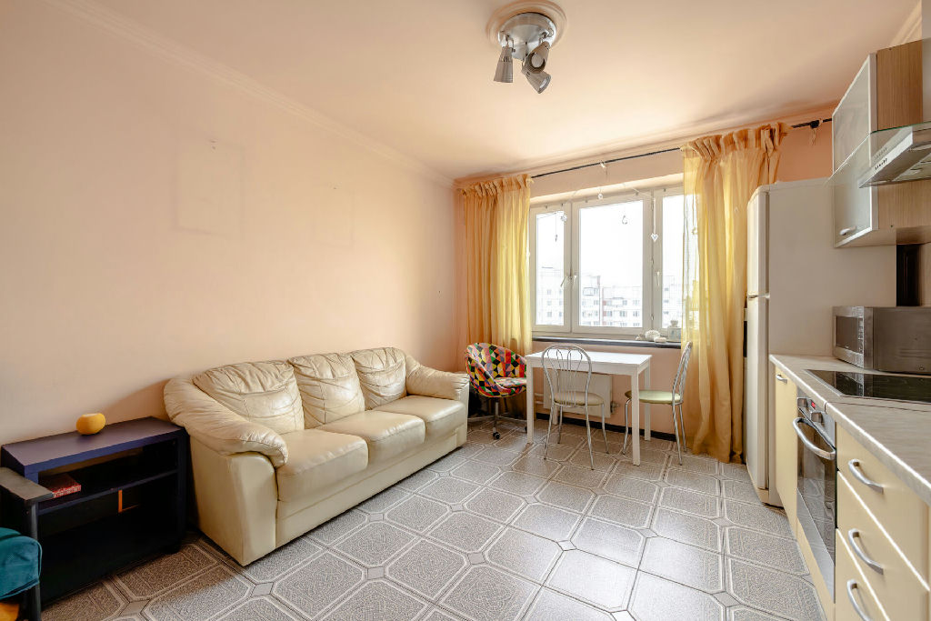 Светлая, уютная, теплая, остается вся встроенная мебель, кухня.