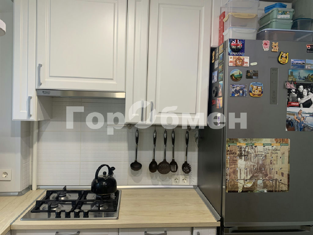 Кухня оборудована встроенной бытовой техникой:холодильник, газовая варочная панель, духовой шкаф, посудомоечная машина, вытяжка. Использован каждый сантиметр площади.