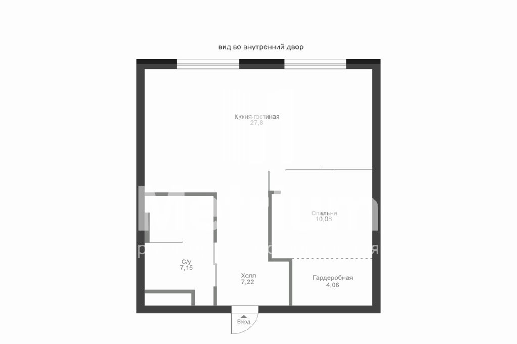 Планировка включает в себя кухню-гостиную, спальню с гардеробной, ванную комнату.