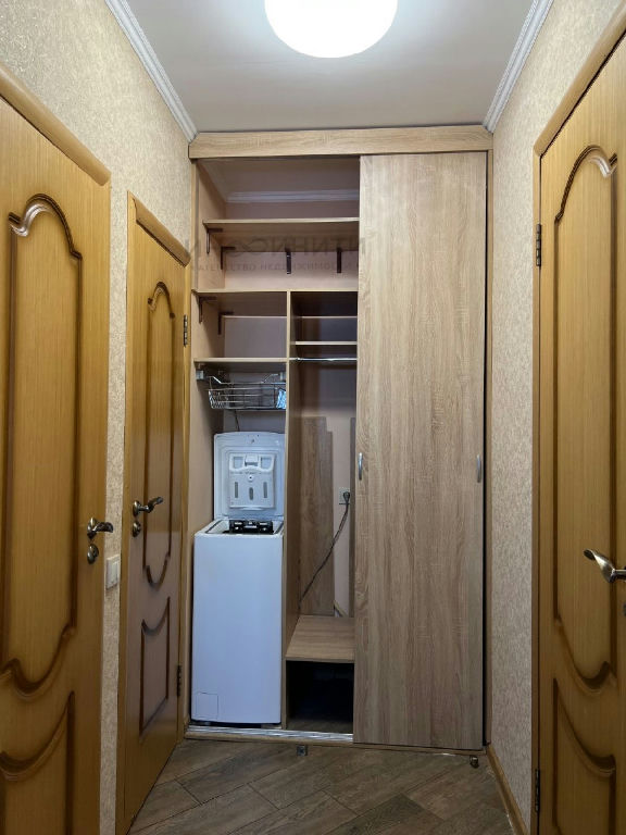 Комфорт в деталях: высокие потолки 2,85 м создают ощущение объема. В коридоре установлен вместительный встроенный шкаф, в санузле современная вертикальная стиральная машина.
