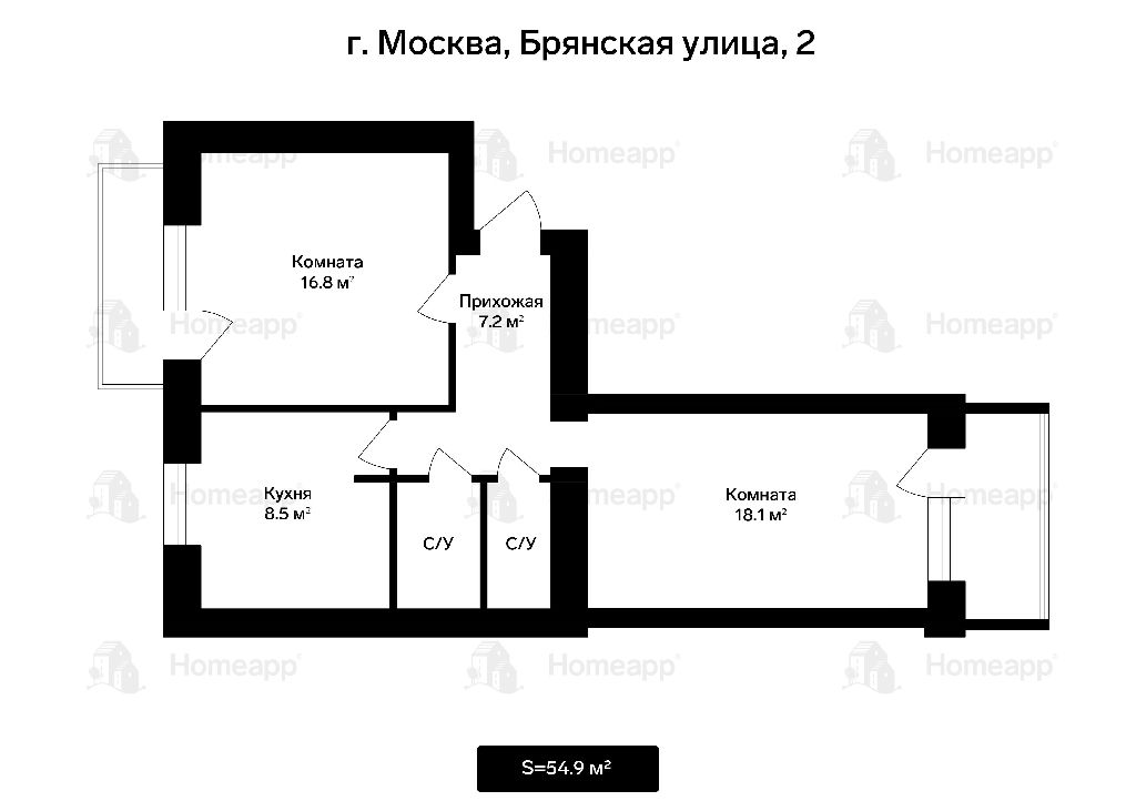 Общая: 54,9 м2