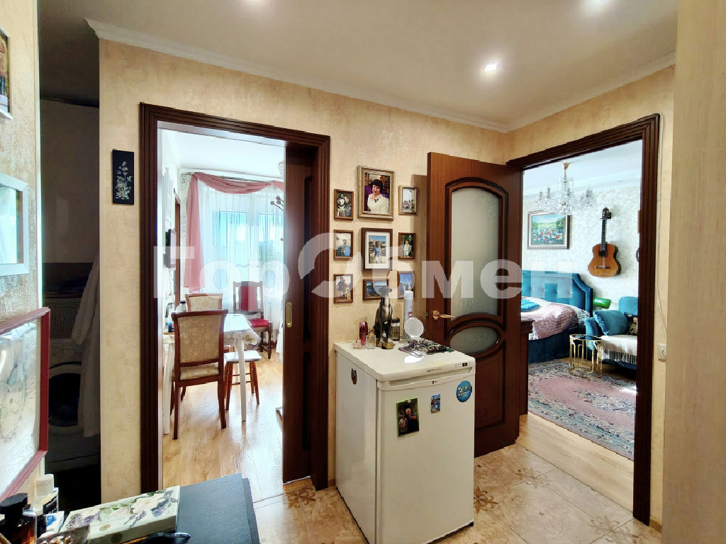 Двухкомнатная квартира с изолированными комнатами. Вход на кухню через маленькую комнату - сделанная перепланировка полностью согласована и зарегистрирована. Благодаря перепланировке в коридоре удалось организовать хозяйственный блок со стиральной машиной и навесным шкафом.