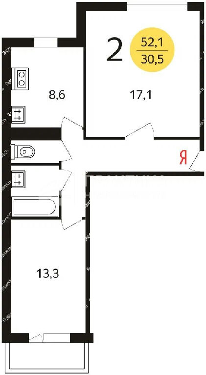 Общая: 51,9 м2