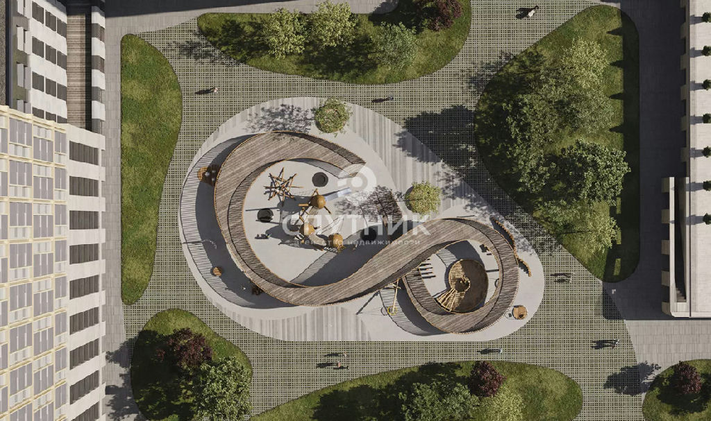 Зеленый двор с прогулочными зонами, теннисными кортами, игровыми пространствами для детей и зоной для йоги.