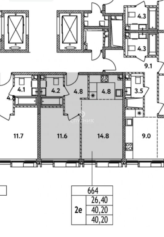 Функциональная планировка: большая кухня-гостиная ( 19.6 кв.м.), при желании можно сделать изолированную комнату (14.8 кв.м.), просторная спальня (12 кв.м.), вместительные прихожая ( 4.8 кв.м) и санузел (4.1 кв. м.), высокие потолки и видовой этаж.