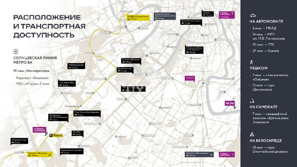 Идеальная транспортная доступность- всего 2 минуты пешком до станции метро Озерная, 20 минут без пересадок и вы в Москва-Сити или аэропорту "Внуково". Всего 5 минут на автомобиле до МКАД, 15 минут до МГУ им. Ломоносова, 20 минут до ТТК и менее получаса до Кремля. Отличный вариант, как для собственного проживания, так и для сдачи в аренду.