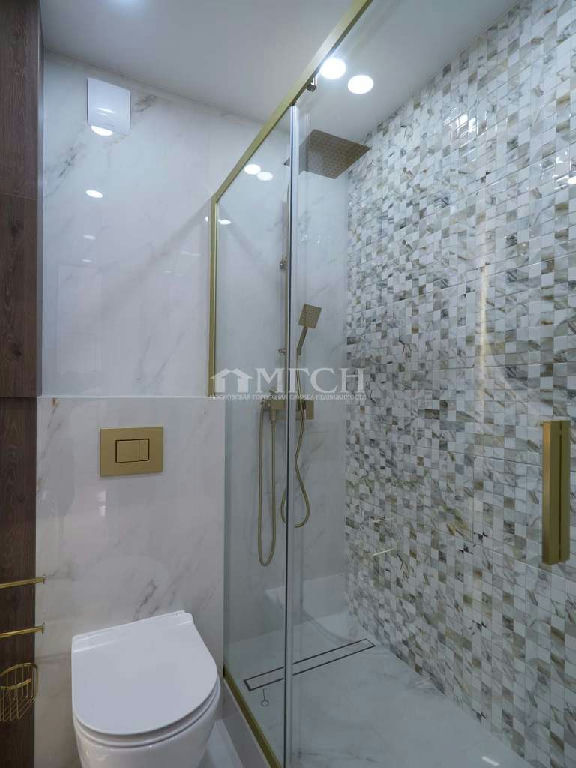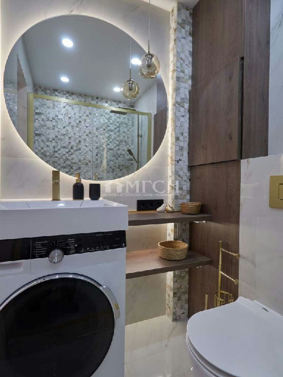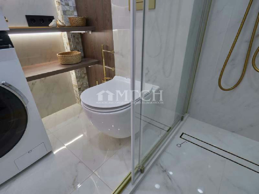 Санузел совмещенный: просторная душевая со сливным треком, стиральная машина, раковина, инсталяция ( унитаз с турбосливом).