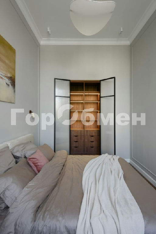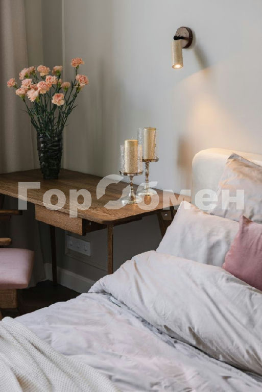 В спальне гардеробная с подсветкой, кровать с ортопедическим матрасом Askona, письменный стол и стул из массива дуба.