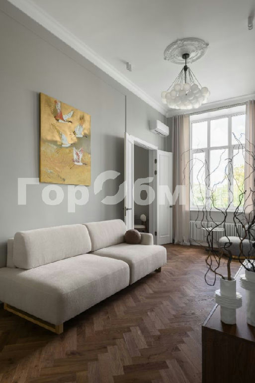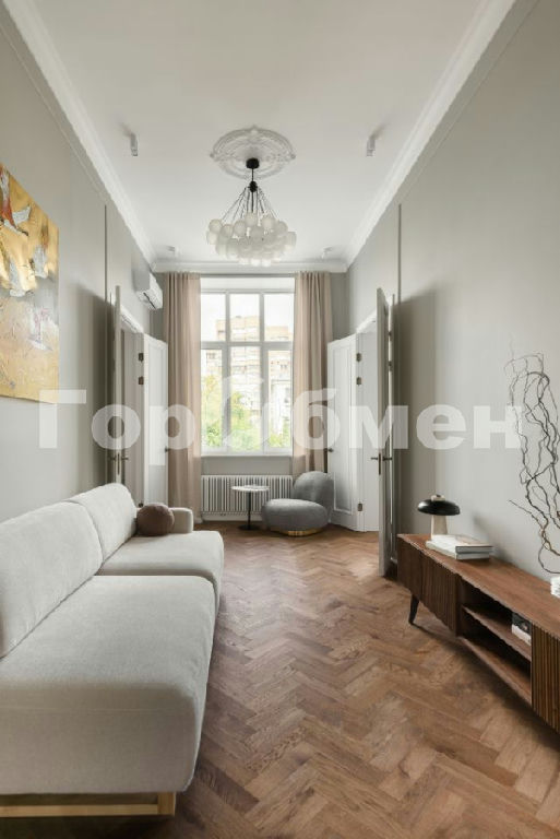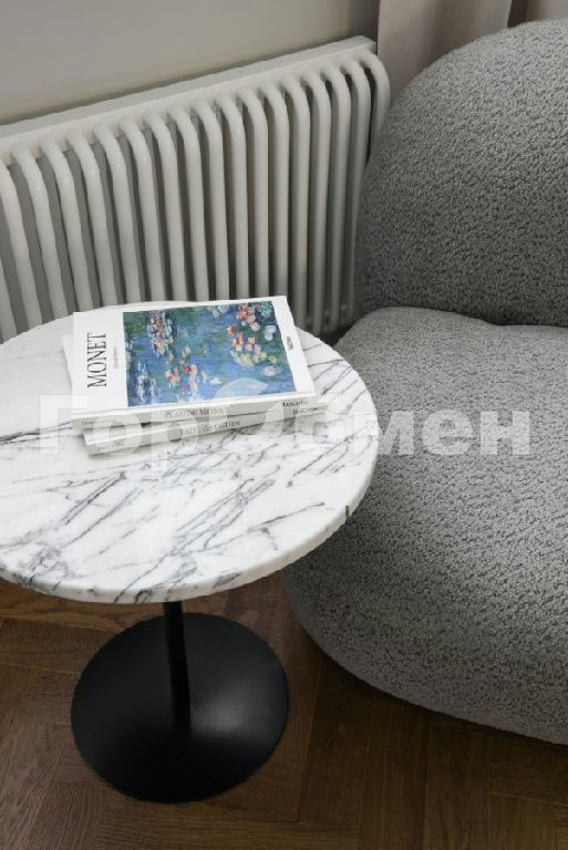 В гостиной новый кондиционер, рассчитанный на площадь всей квартиры, стол и консоль из мрамора, картина русского художника.