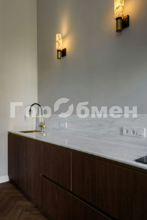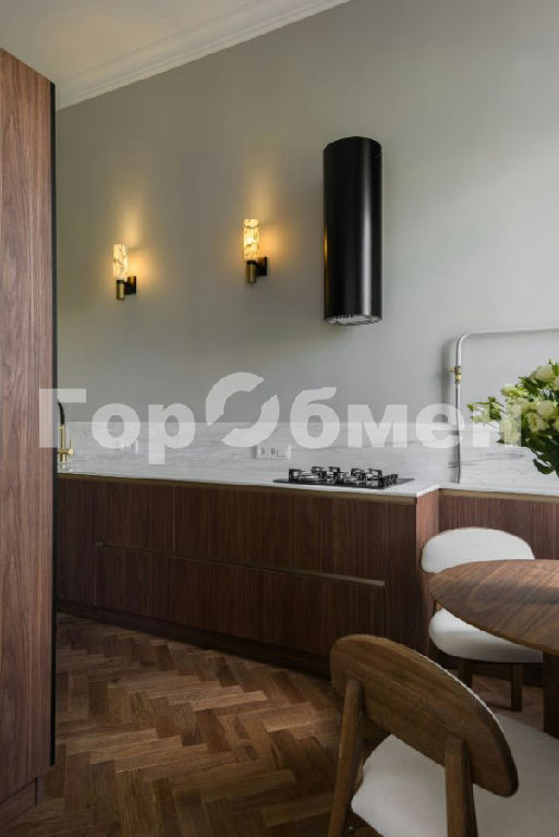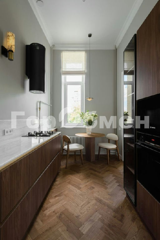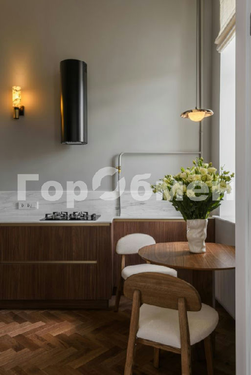 На кухне встроенная посудомоечная машина, духовой шкаф, микроволновая печь, варочная панель, холодильник. Столешница и фартук выполнены из натурального мрамора. Стулья из массива дуба, стол из дубового шпона, мраморные светильники,