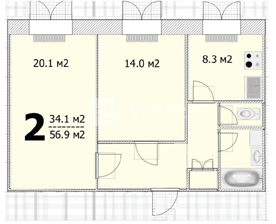 Общая: 56,9 м2