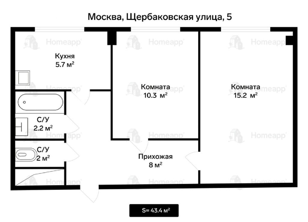 Общая: 43,4 м2