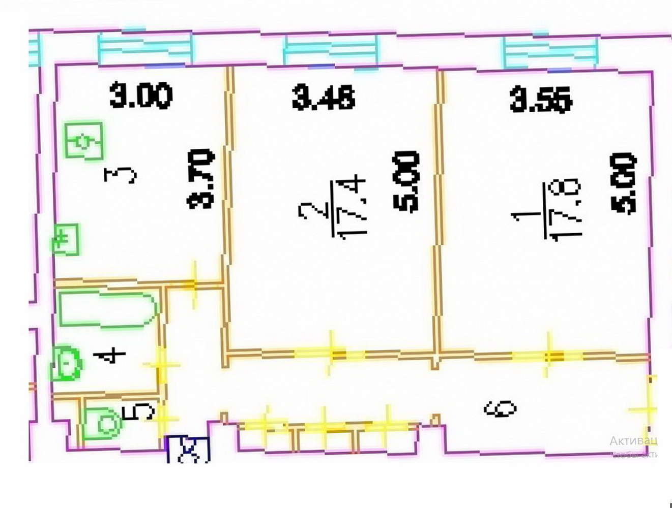 • 2 изолированные комнаты: 17.8 кв.м. и 17.4 кв.м., жилая площадь 35.2 кв.м., площадь кухни 11.1 кв.м.