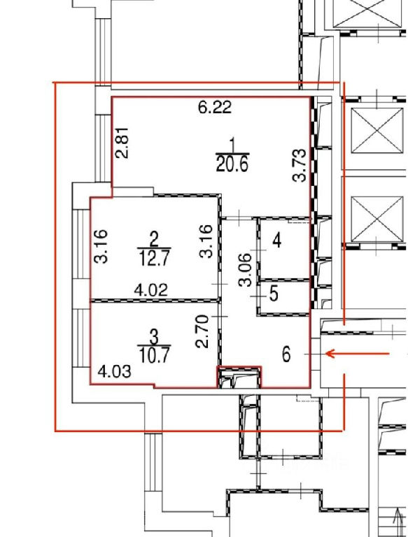 Общая площадь S = 57,4кв.м., кухня 11м, изолированные комнаты (20,6 и 12,7)м, санузел раздельный.
