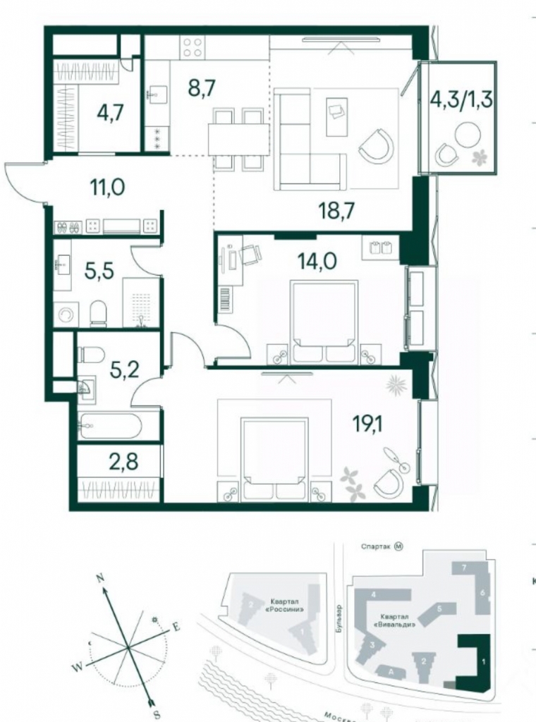 • Удобства на расстоянии приятной прогулки: супермаркеты, кафе, рестораны с верандами, салоны красоты, аптеки и многофункциональный центр для шоппинга и развлечений.