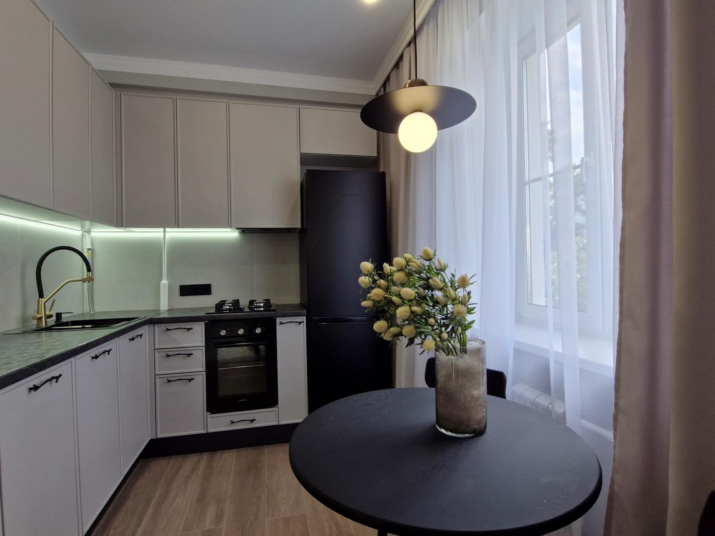 Кухня с великолепной обеденной группой, укомплектована посудомоечной машиной, холодильником, вытяжкой с рециркуляцией воздуха, газовой варочной панелью и электрическим духовым шкафом.