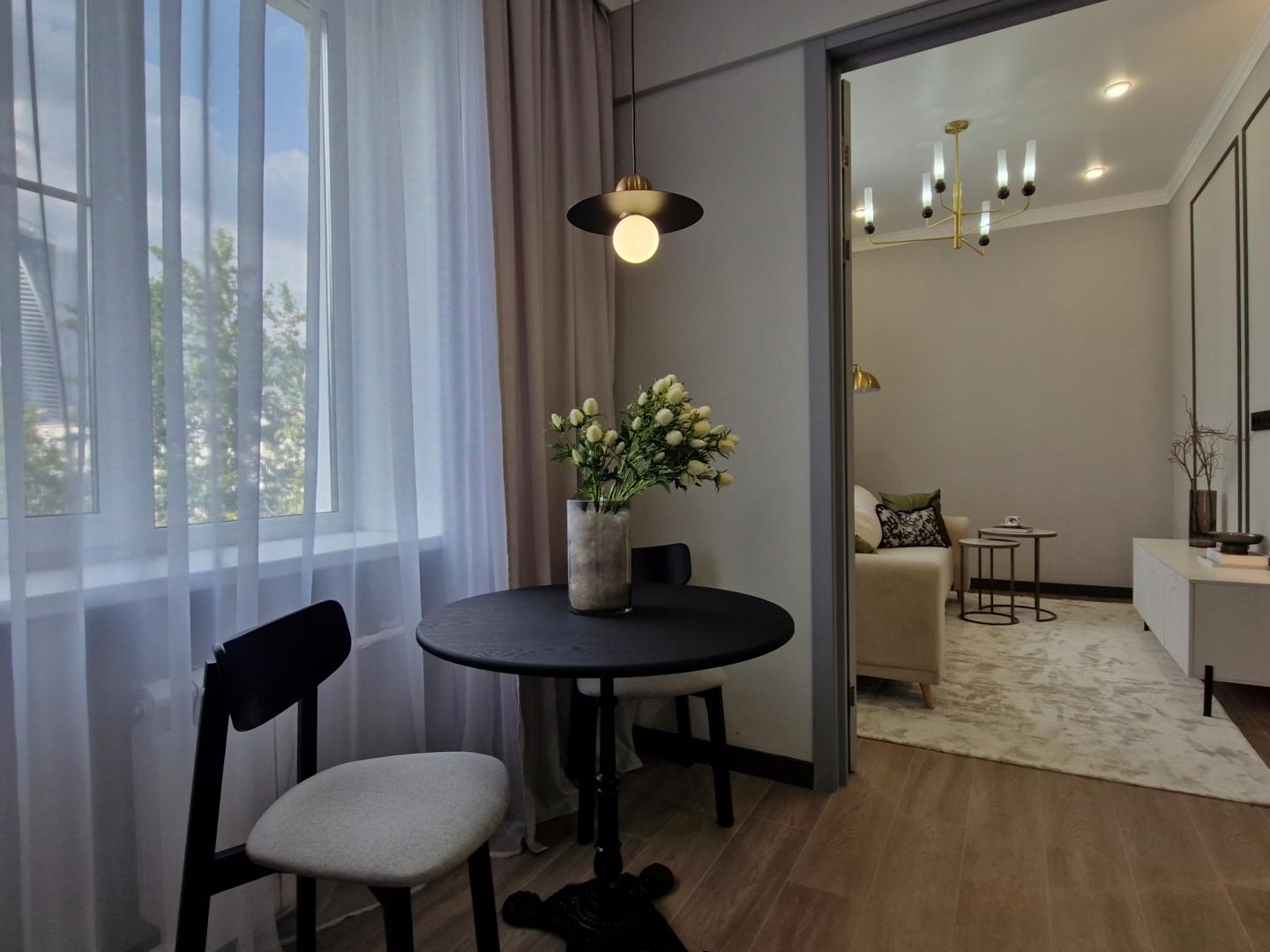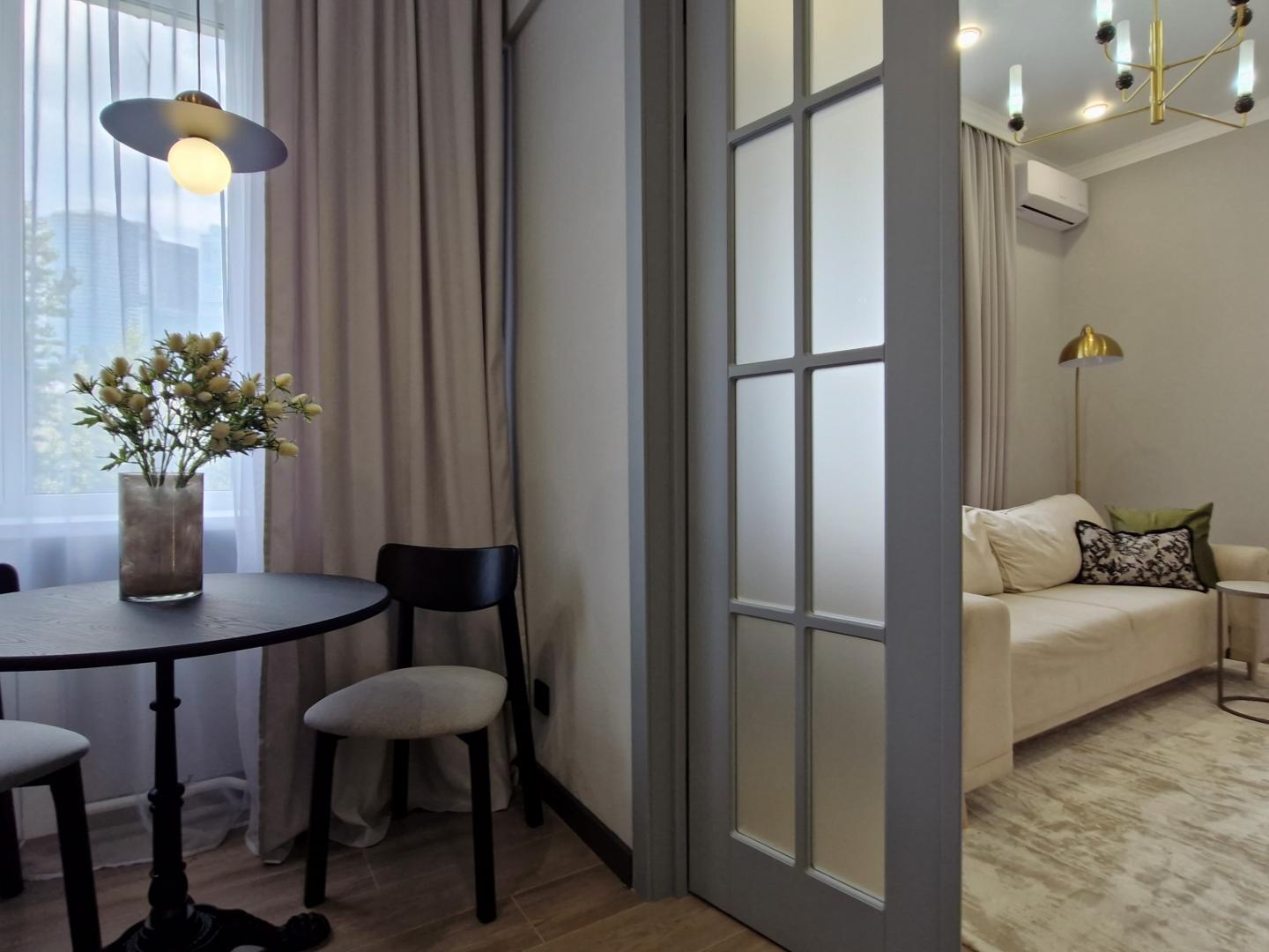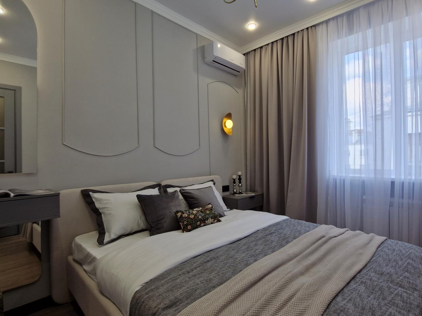 Кровать с высоким мягким изголовьем оборудована подъемным механизмом, позволяющим с удобством использовать место под кроватью в качестве дополнительной зоны хранения. Гардеробная позволит свободно разместить одежду и обувь, а также выделить хозяйственную зону для пылесоса, гладильной доски, чемоданов и других крупногабаритных предметов. Гостиная комната с удобным раскладным диваном и видом из окна на Москва-Сити. В каждой комнате установлен кондиционер. Интерьер построен на сочетании классических и современных элементов. Классические акцентные молдинги на стенах перекликаются с современными формами мебели, создавая уникальный и сбалансированный образ. Плавные линии, округлые формы и лаконичный декор сделали пространство мягким, уютным и живым. Продуманная подсветка — особенно за зеркалами — помогает акцентировать внимание на текстурах и зонах, создавая мягкую и уютную атмосферу. А винтажные люстры сохраняют историю квартиры. Ламинат с текстурой натурального дерева выложен единым полотном, что визуально увеличивает пространство и связывает весь интерьер в единую композицию.