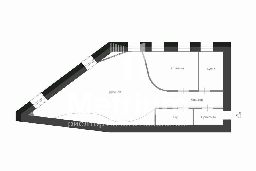 Планировка включает в себя кухню, гостиную, спальную комнату, санузел.