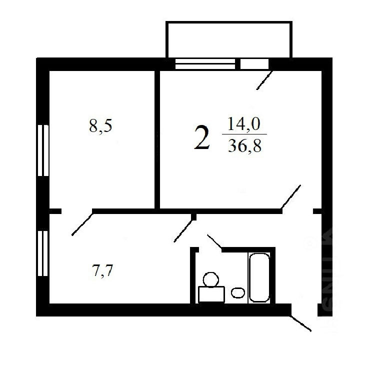 Общая площадь 36,8 м2. Кухня 7.7 м2, изолированные комнаты 14.0 и 8.5 м2. Туалет и ванна совмещены. Окна на две стороны. В квартире выполнен приличный ремонт. На полу ламинат 33-го класса, качественные межкомнатные двери, везде стеклопакеты (вкл. балкон), заводская входная металлическая дверь, свежая мебель и кухонная техника. По договорённости мебель и техника остаются.