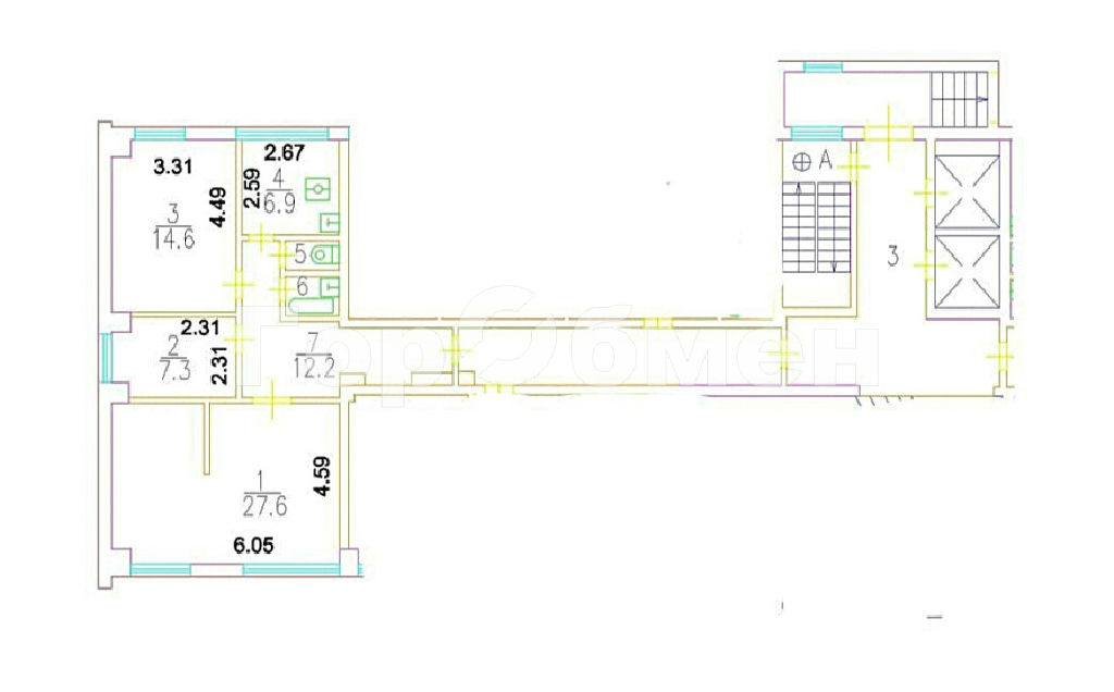 Комнаты: 27.6 14.6 7.3 м2