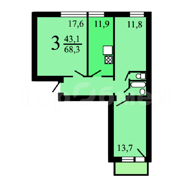 Комнаты: 17.6 11.9 11.8 м2