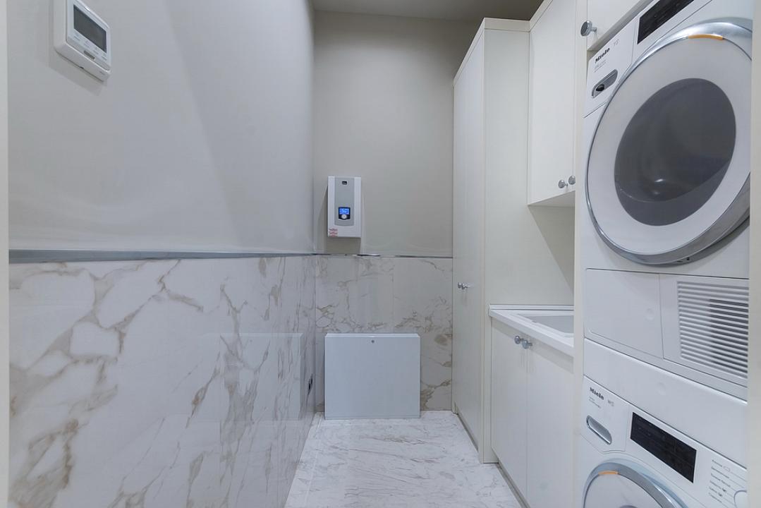 Продуманная до мелочей планировка квартиры: гостиная-столовая, кухня с выходом на закрытую террасу, 2 спальни со своими гардеробными и санузлами, большая постирочная комната со стиральной и сушильной машиной, гостевой санузел.