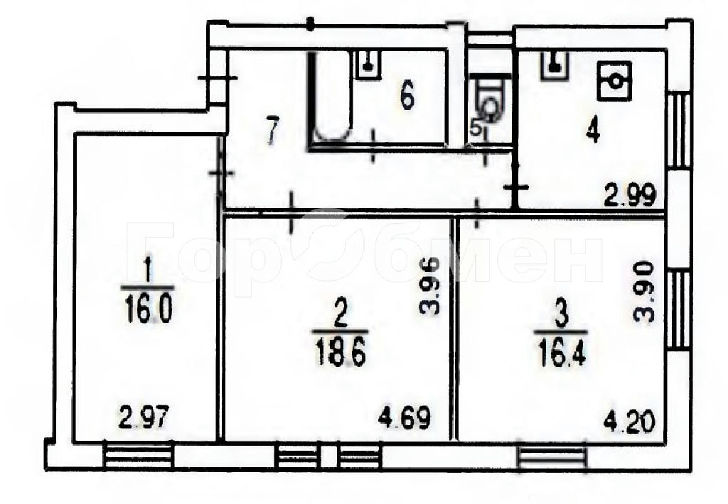 Комнаты: 18.6 16.4 16.0 м2