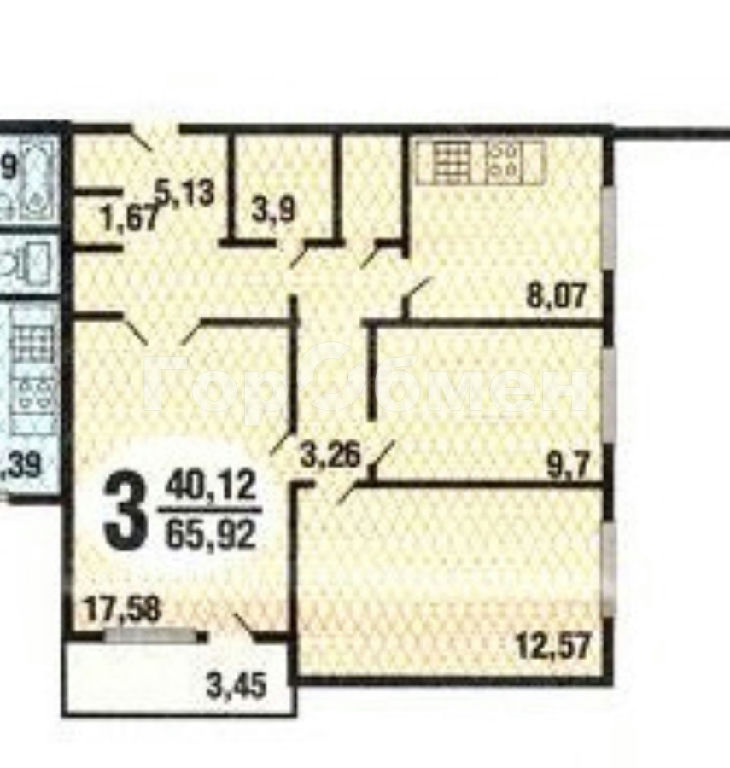 Площадь с учетом балкона 68 кв.м., общая площадь 66 кв.м., жилая площадь 40,8 кв.м., комнаты: 18; 12,8 и 10 кв.м. изолированы, просторная кухня 8,6 кв.м., санузел раздельный, балкон остеклен, стеклопакеты; окна выходят в тихий зеленый двор, из окон открывается панорамный вид на город. Квартира очень светлая.