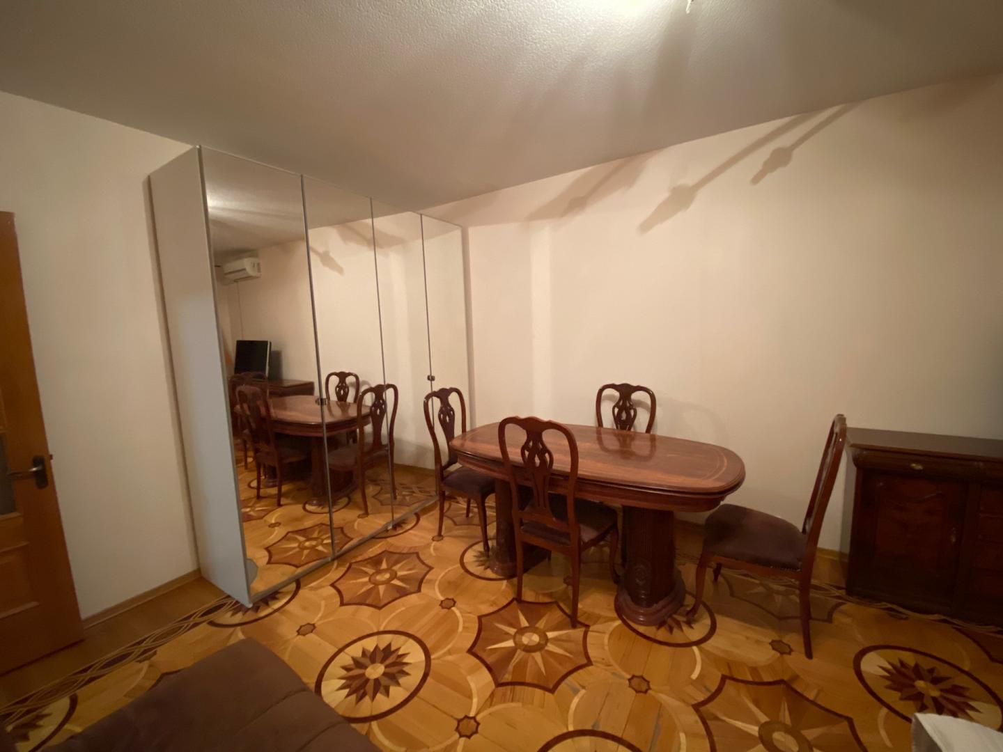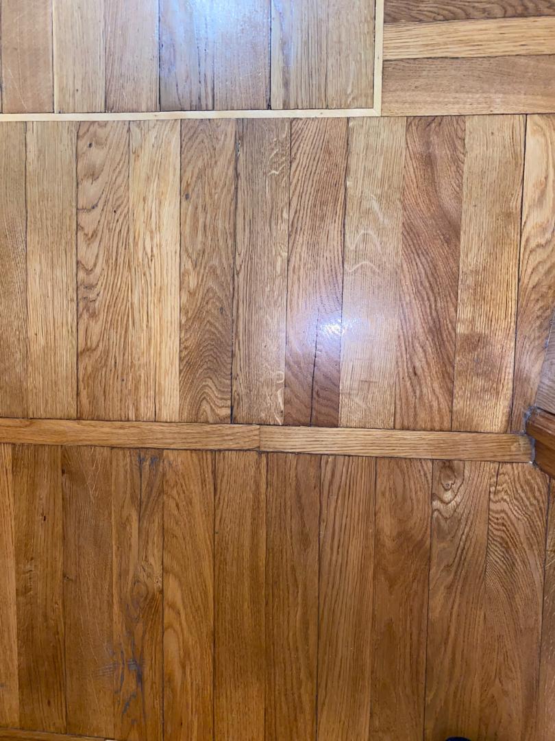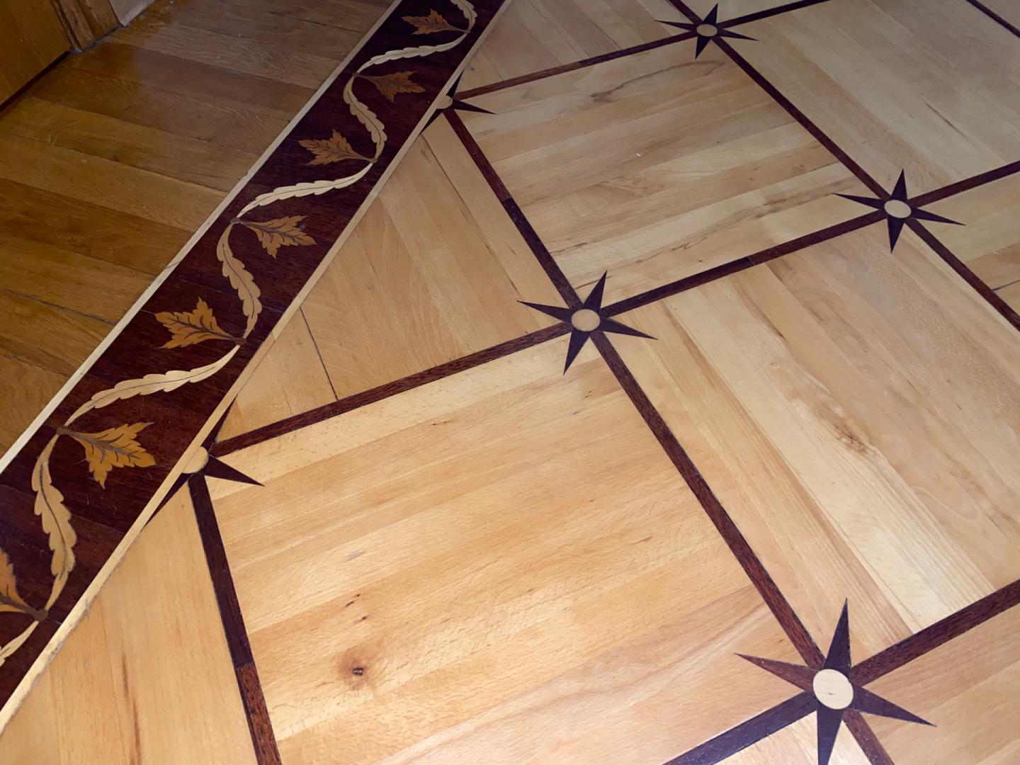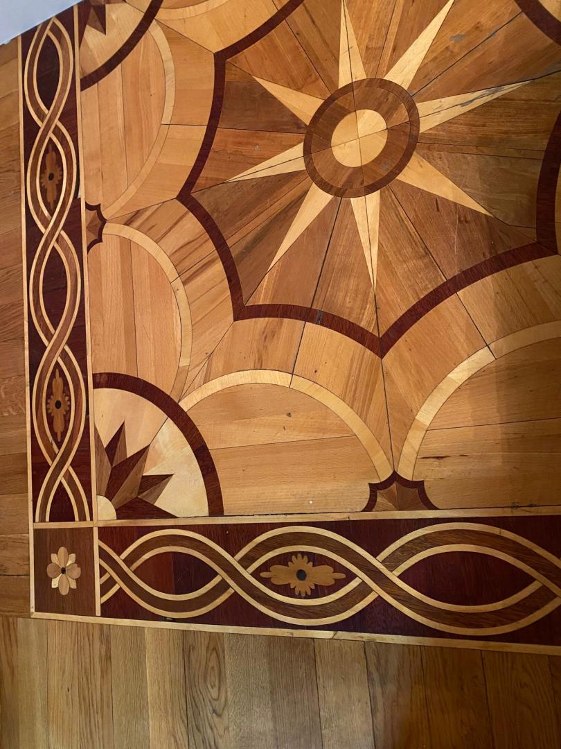 На полу плитка и художественный паркет из ценных пород дерева. Паркет в хорошем состоянии, в редких местах требуется реставрация.