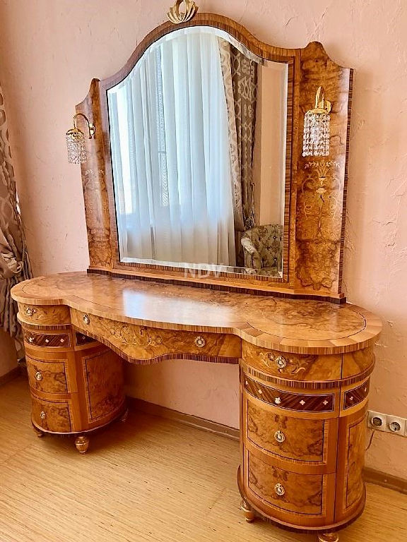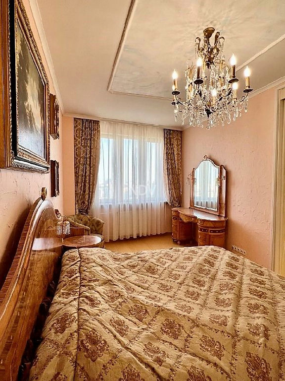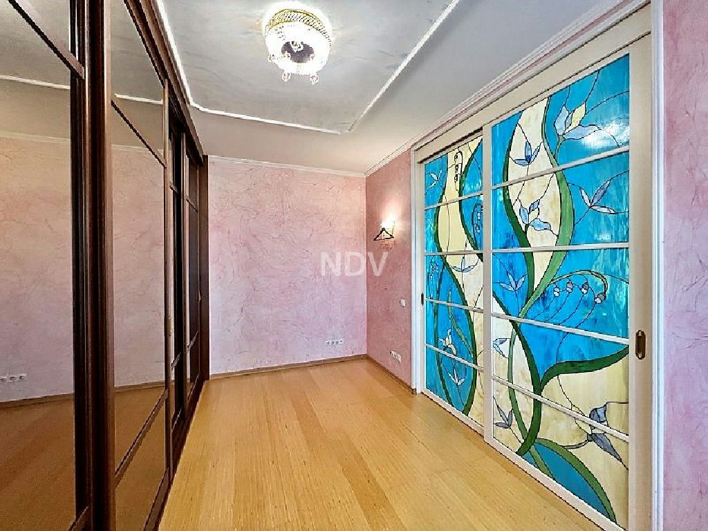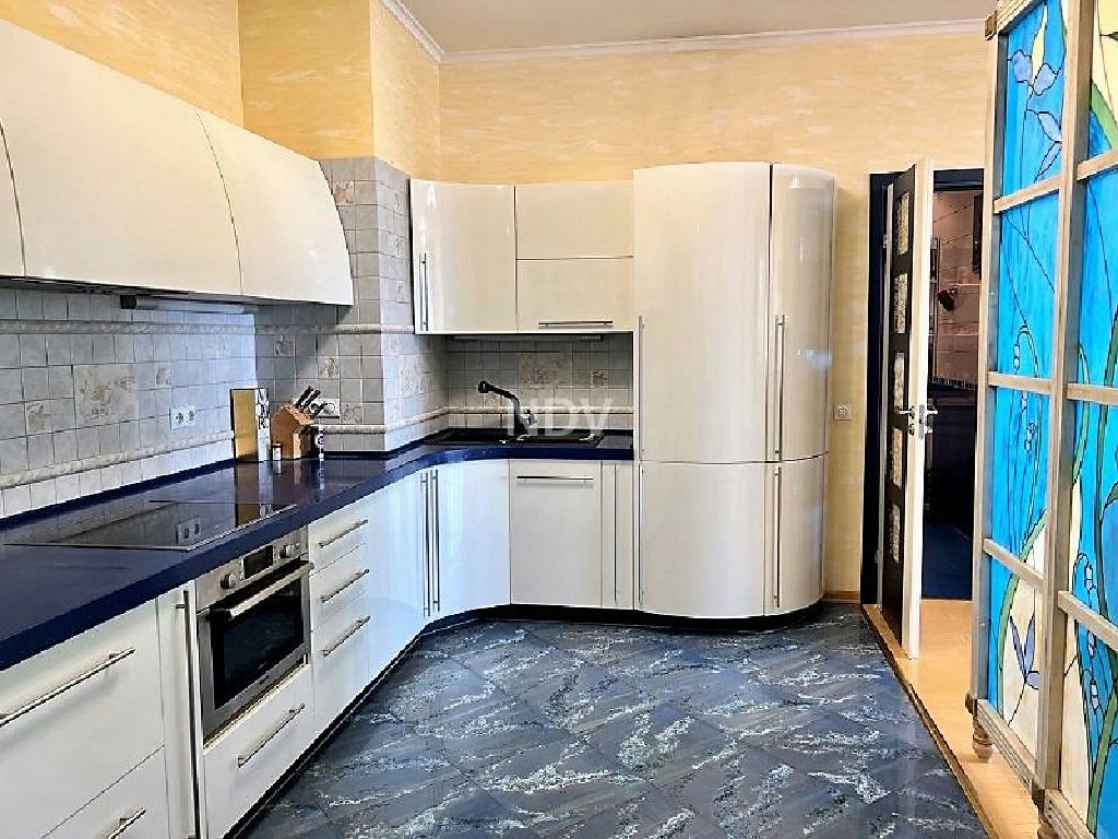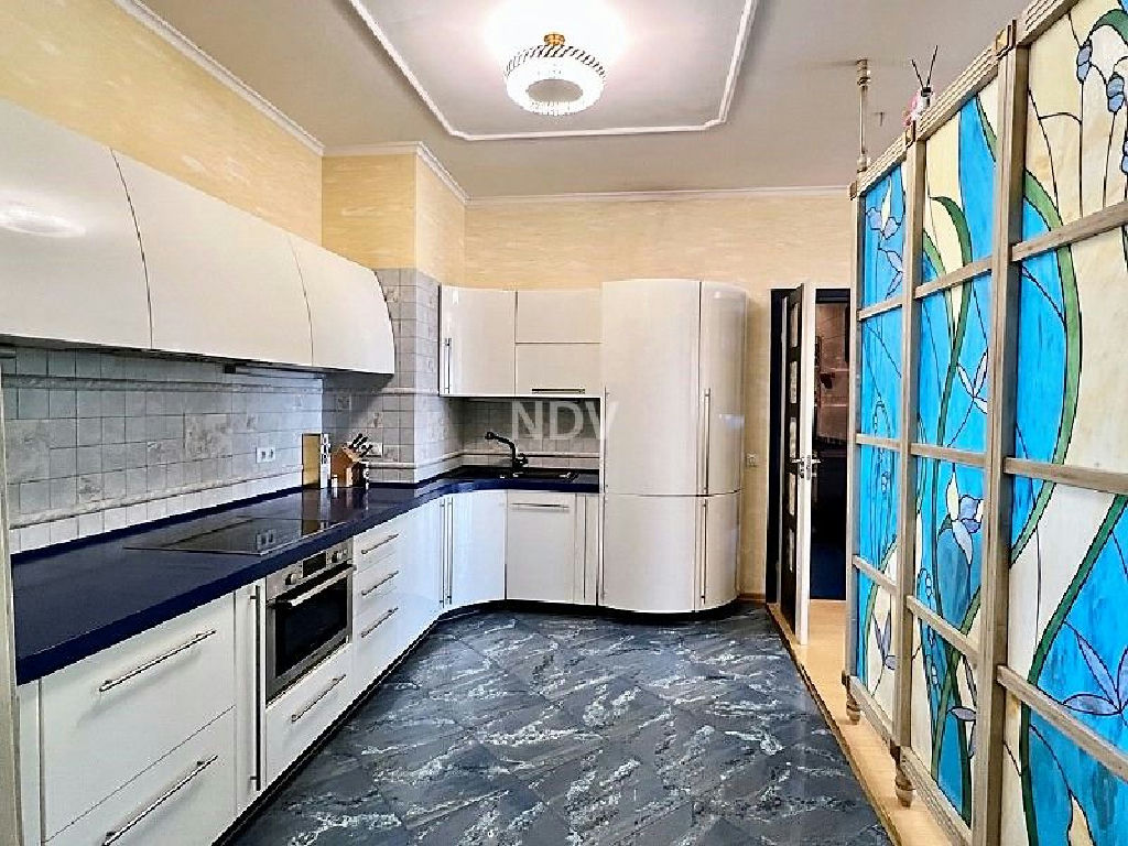 Собственники квартиры, обладая великолепным вкусом, продумали каждую деталь, вплоть до мелочей. Сделан чудесный ремонт в приятных бежево-голубых тонах. Потолки высотой более 3 метров! На полу в санузле, коридоре и на кухне - плитка (теплый пол), в жилых комнатах ламинат. Хрустальные светильники, приятных оттенков шторы, красочные витражи, картины, мягкая мебель, дорогой спальный гарнитур из карельской березы создают красоту и уют. Нет ничего лишнего, все стильно и очень достойно.