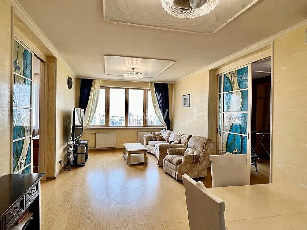 В квартире много света, выполнен дорогой дизайнерский ремонт. За счет высокого этажа из окон открывается просто потрясающий вид на красавицу Москву! Вы непременно оцените данную квартиру, когда будете любоваться восходами или сверканием ночных огней мегаполиса. Планировка квартиры очень удачная: холл, гостиная, кухня, отдельная гардеробная, прекрасная изолированная хозяйская спальня, гостевая спальня или кабинет с выходом на остекленную лоджию, постирочная, небольшая кладовая, просторный совмещенный санузел с ванной-джакузи, биде и итальянским мойдодыром. Общая площадь 99,5 кв.м. В квартире установлены кондиционеры, бойлер на случай отключения горячей воды, стиральная машина. Квартира полностью меблирована, вплоть до телевизора. Кухня оборудована всей необходимой мебелью и встроенной техникой фирмы Bosch, которая удовлетворит запросы самой взыскательной хозяйки, включая холодильник, варочную панель, вытяжку, посудомоечную машину и микроволновую печь.