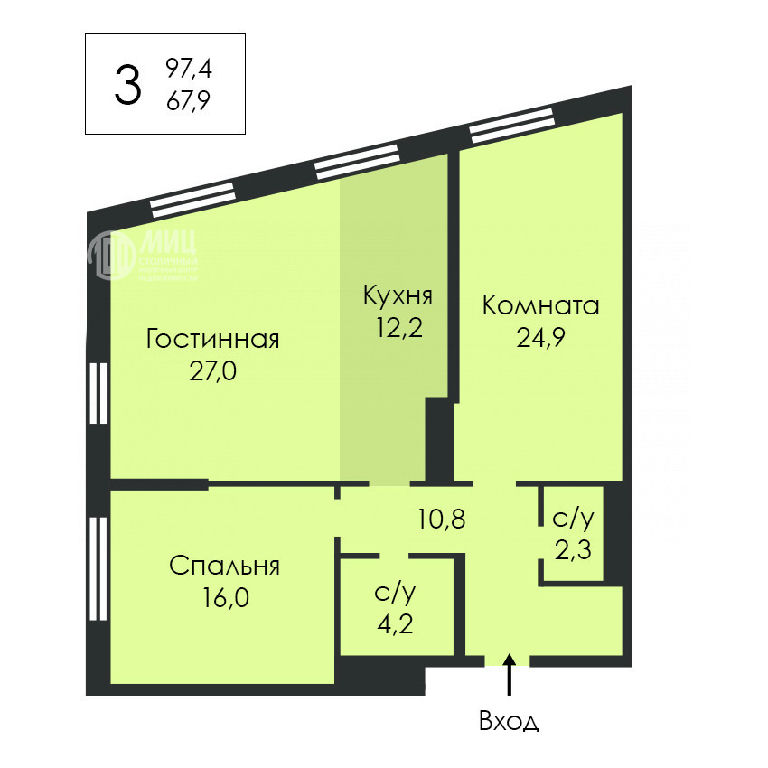 Планировка: евро-3 комнатная, общая площадь 97,4 кв.м, кухня-гостиная 39,2кв.м с тремя окнами увеличенной площади. 2 спальни разнесены по обе стороны от гостиной, что очень удобно, т.к. не мешает членам семьи заниматься каждый своим делом. Два санузла: совмещенный с ванной и гостевой. В прихожей удобно разместить систему хранения для верхней одежды. Большие жилые комнаты дают возможность оборудовать гардеробные. Высота потолка 3,1м. Средний этаж.