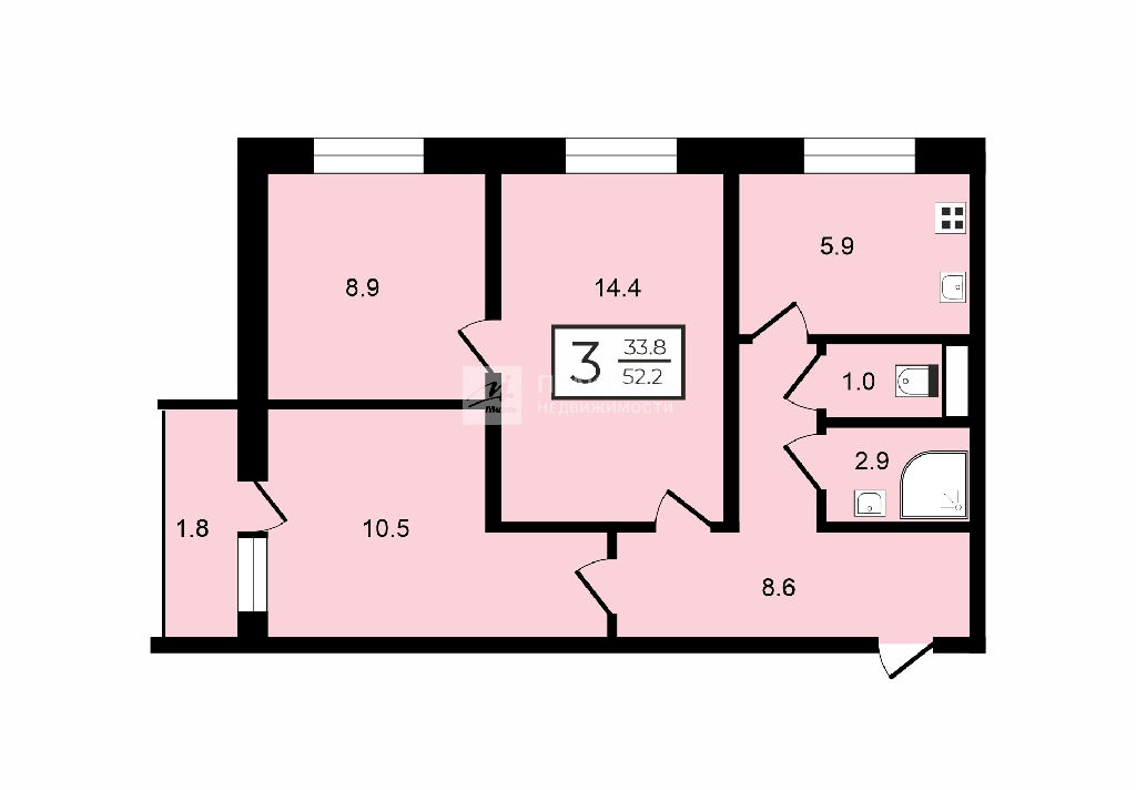 Общая: 52,2 м2