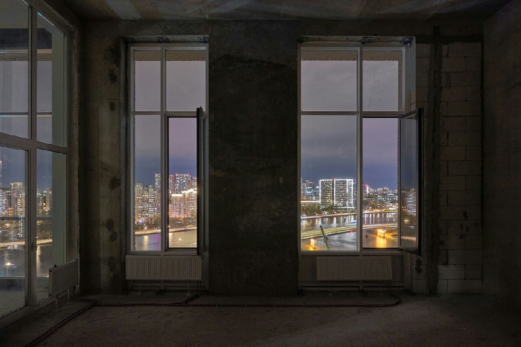 Высота потолков и второй уровень усиливают ощущение пространства: квартира воспринимается не как обычная квартира в бетоне, а как заготовка под настоящий городской пентхаус.