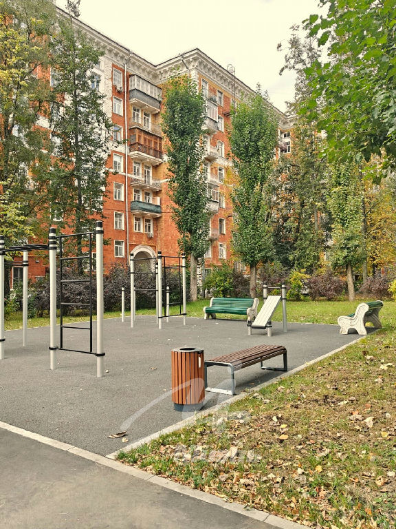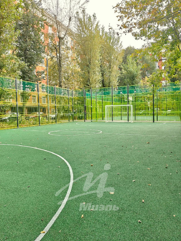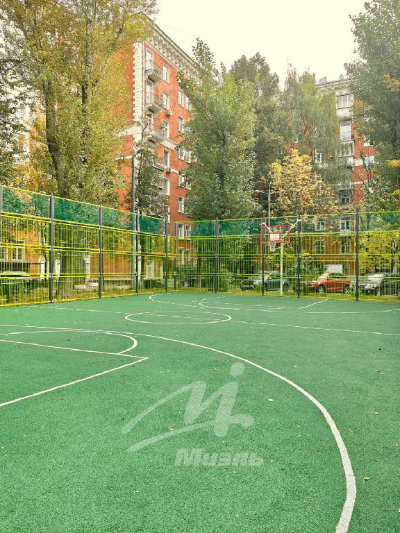 Окна выходят в один из ухоженных дворов Москвы, где каждый житель найдет чем заняться. Прямо во дворе есть и парк, и фонтан, тренажерная и детская площадки, поле для футбола и для баскетбола.