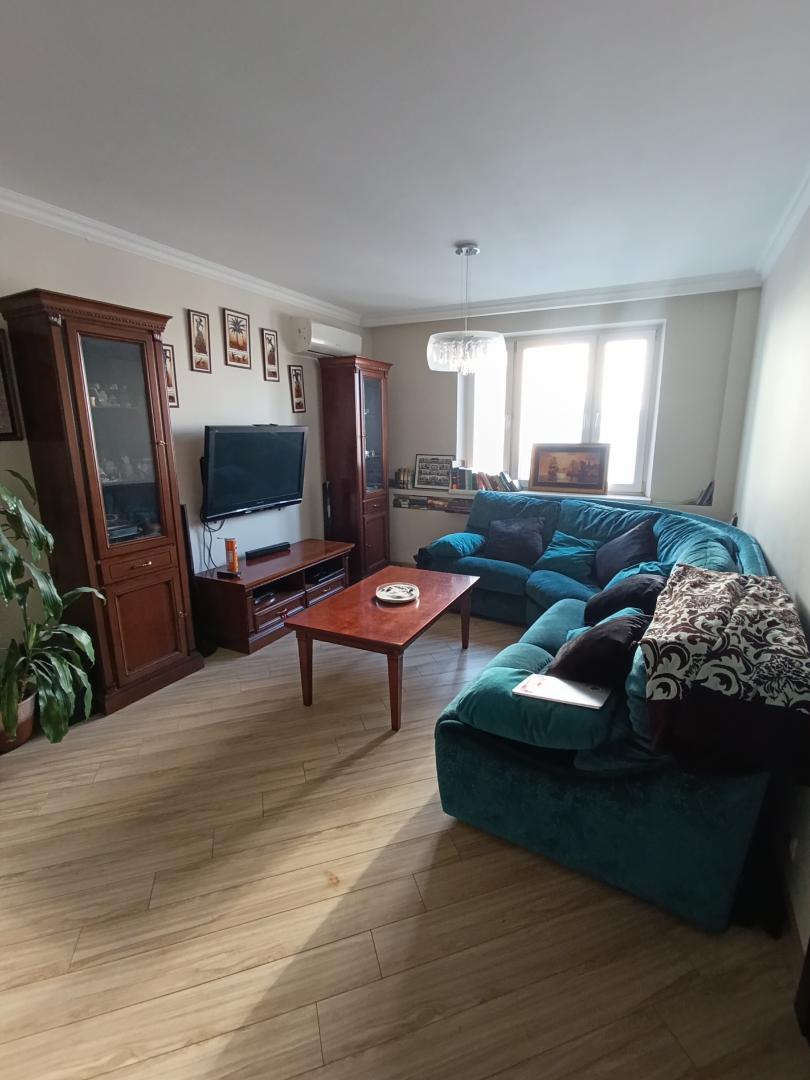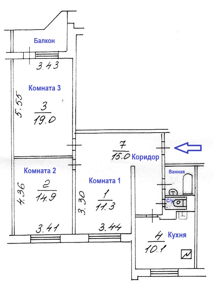 Квартира: удачная планировка, большие комнаты, окна на две стороны. Общая площадь - 74,3 м2, жилая - 45,2 м2 (19 м2-14,9 м2-11,3 м2), коридор – 15 м2, кухня – 10,1 м2, все окна выходят во двор, СУ раздельный.