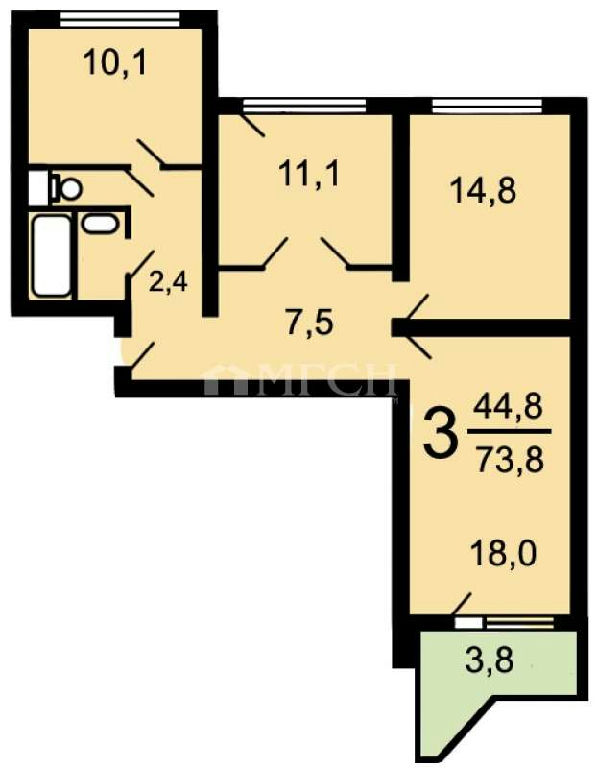 Комнаты: 18-14.8-11.1 м2