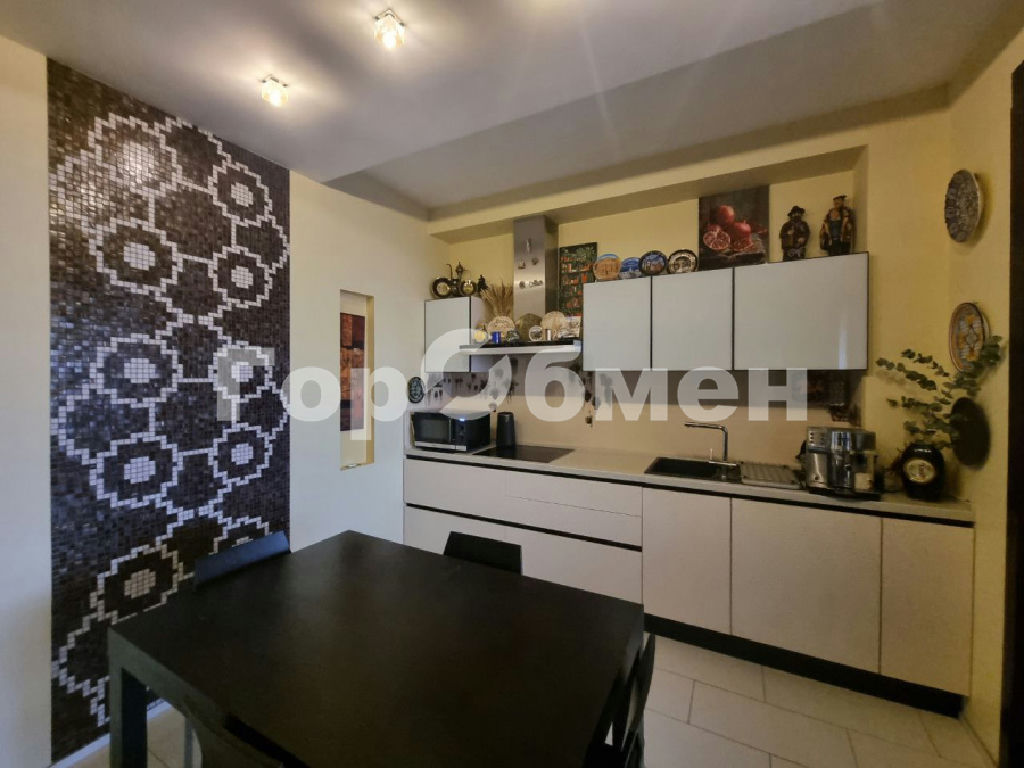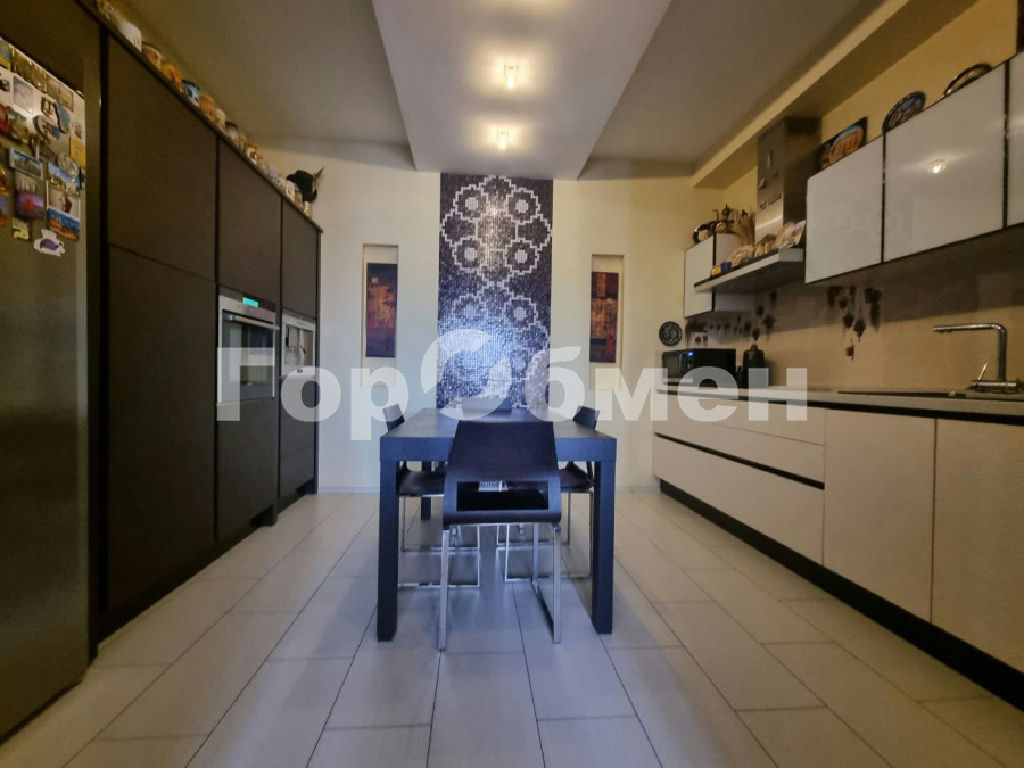 На кухне установлен итальянский встроенный гарнитур со встроенной техникой: холодильник и морозильная камера Liebherr, духовой шкаф, варочная панель, вытяжка, посудомоечная машина, кофеварка Siemens. Столешница из натурального камня Кварц.
