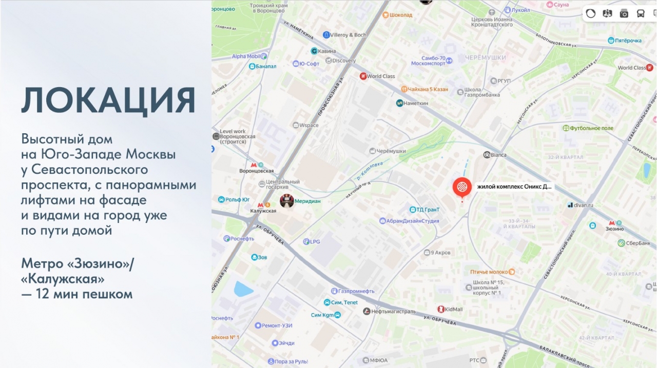 Новые Черемушки м. (5 мин. транспортом)