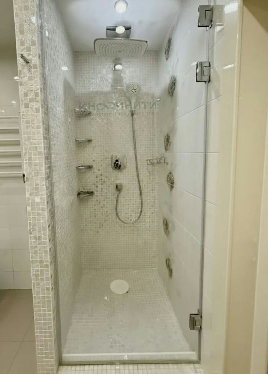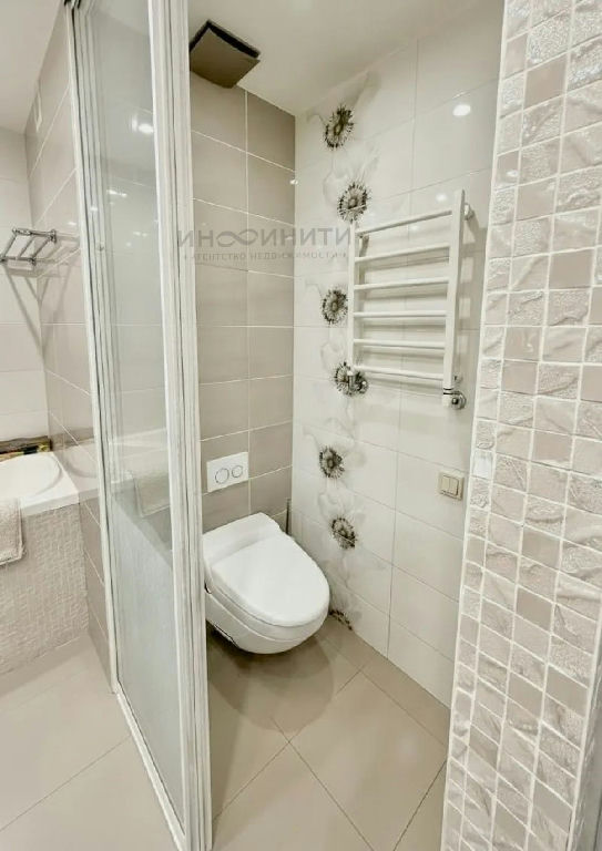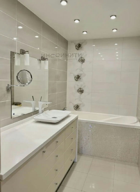 Очень просторная ванная комната: глубокая ванна для вечернего релакса и полностью отдельная душевая зона. Плитка, сантехника и вентиляция - всё выполнено на уровне премиум-ремонта.