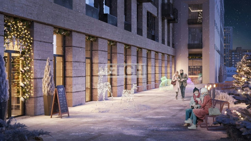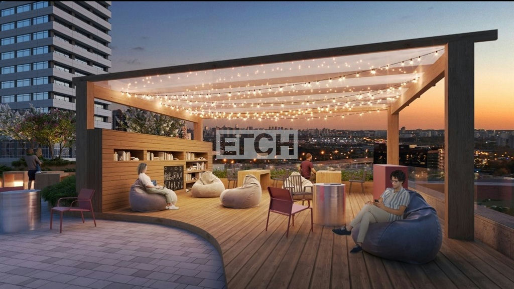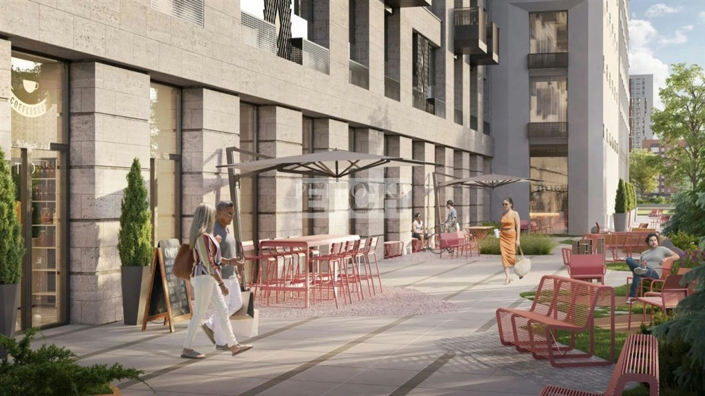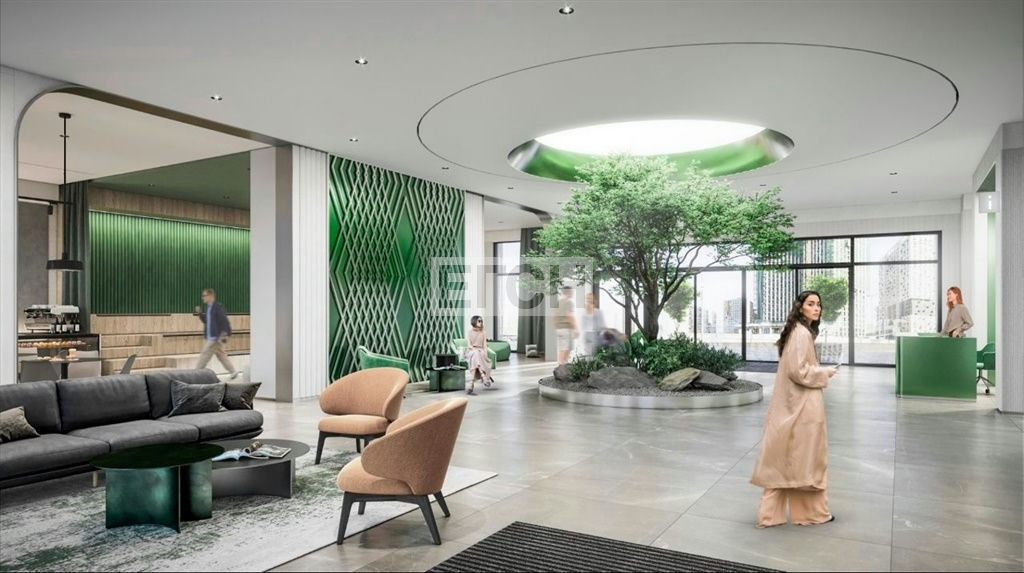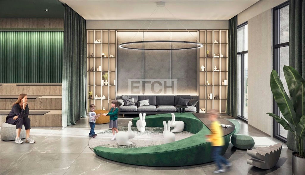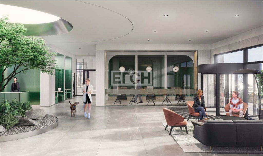 Гранд-лобби с зоной ожидания, кафе и рабочим пространством, центральным озеленением и детской зоной.